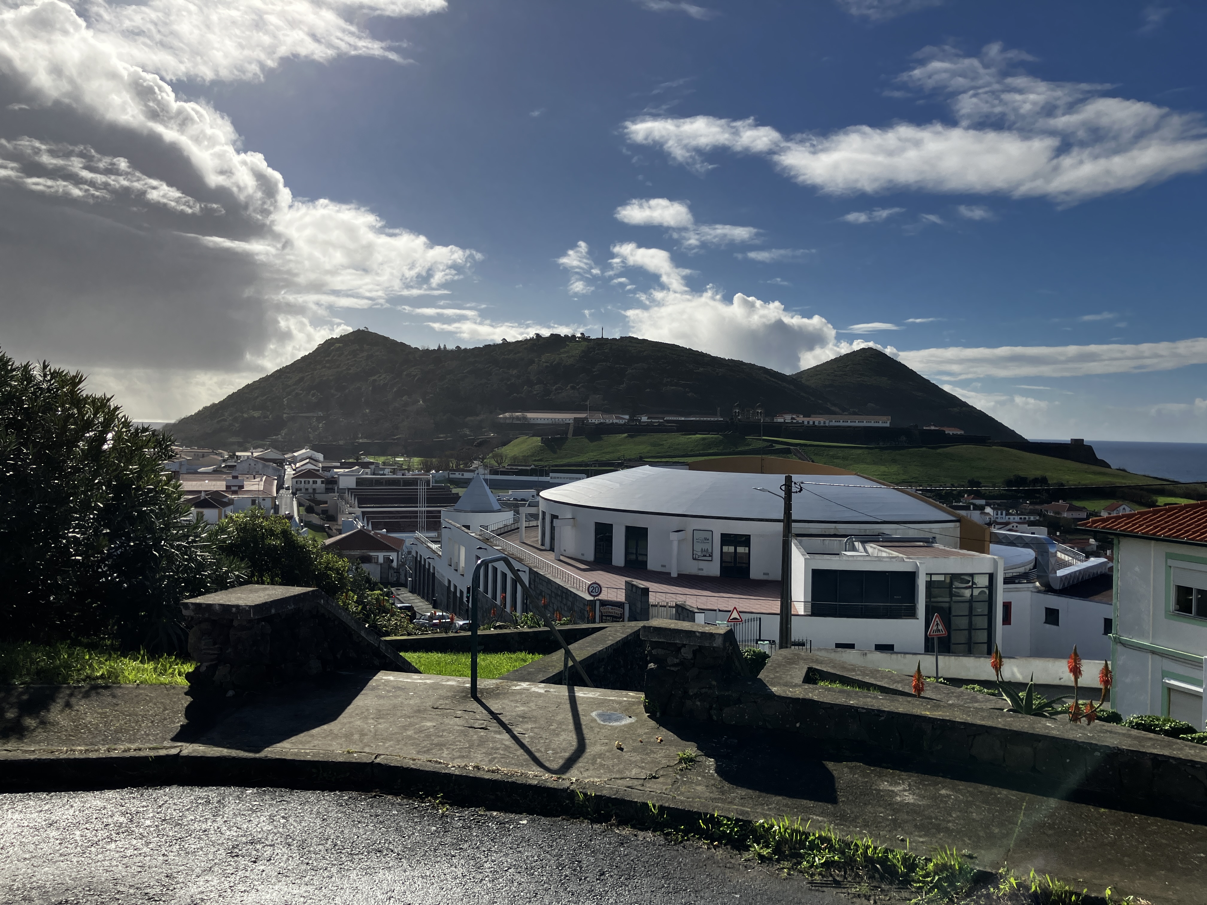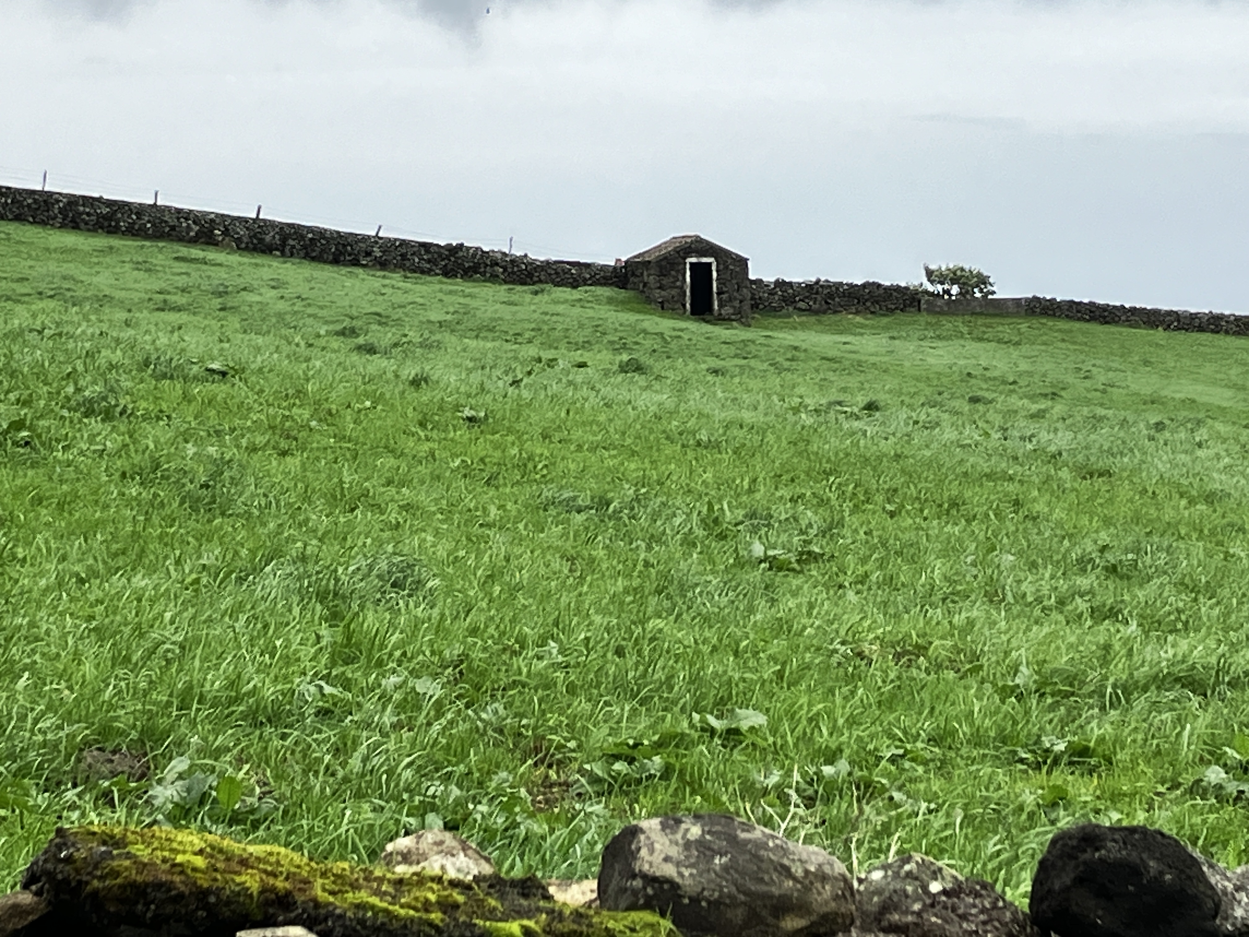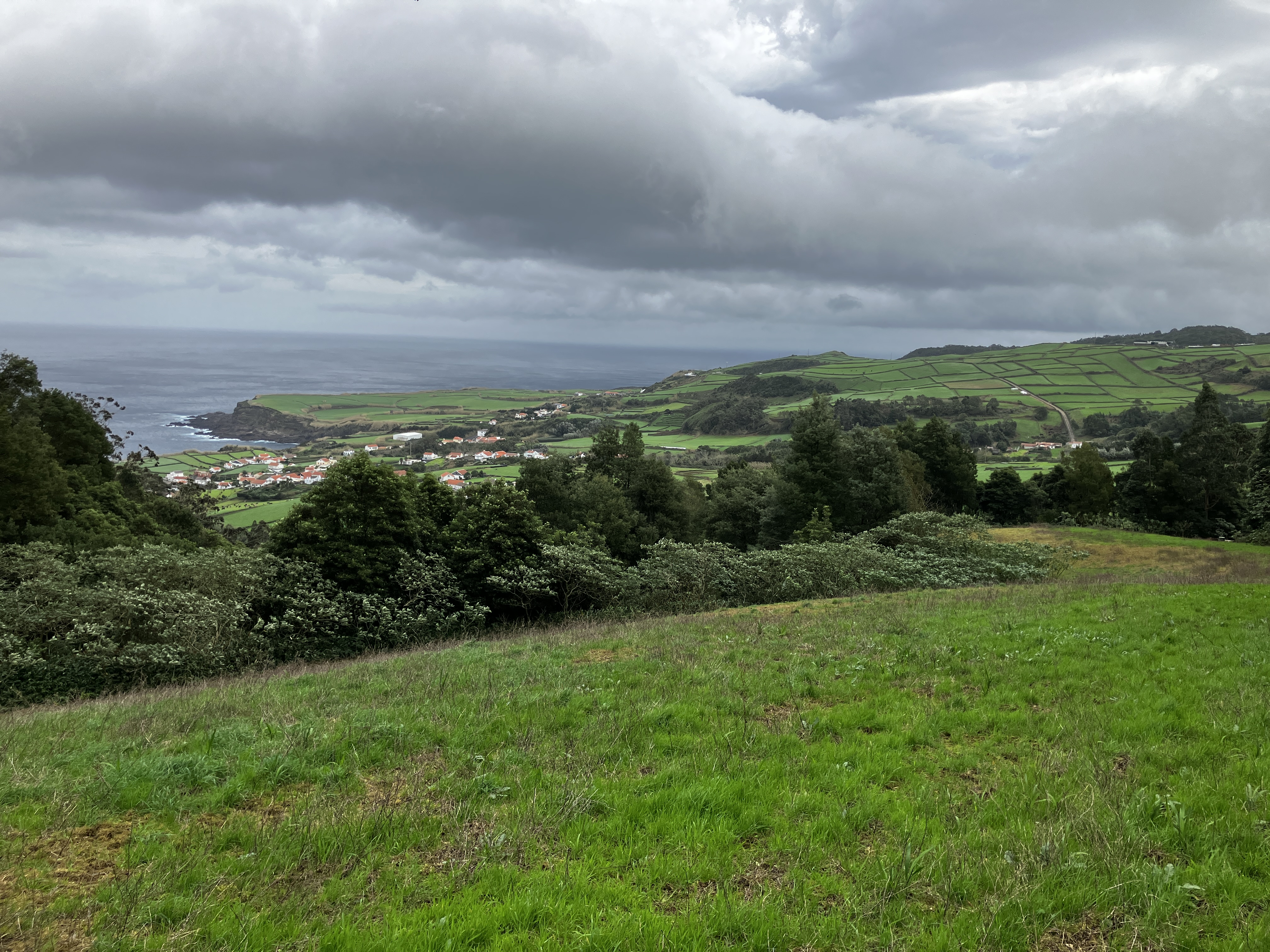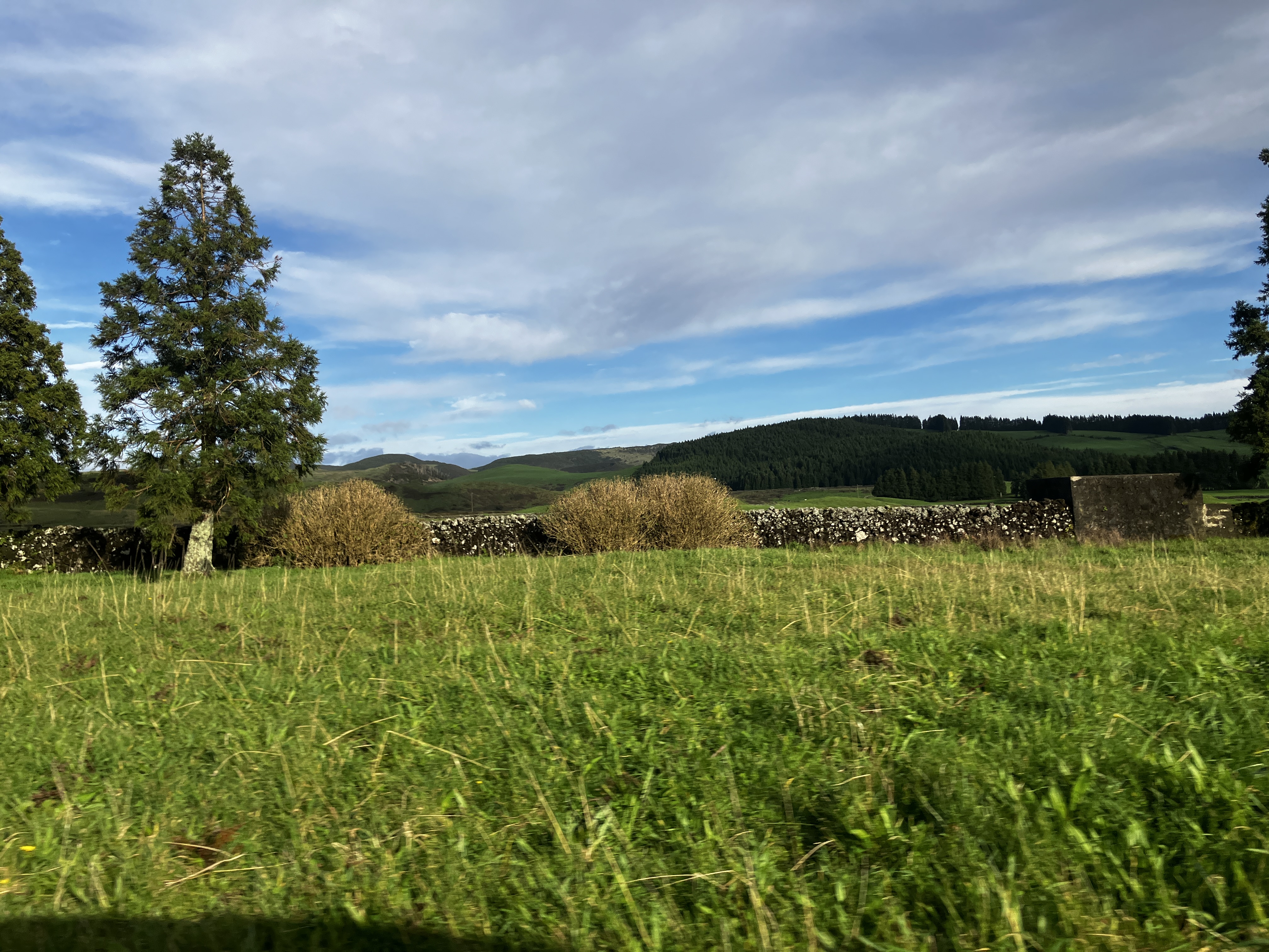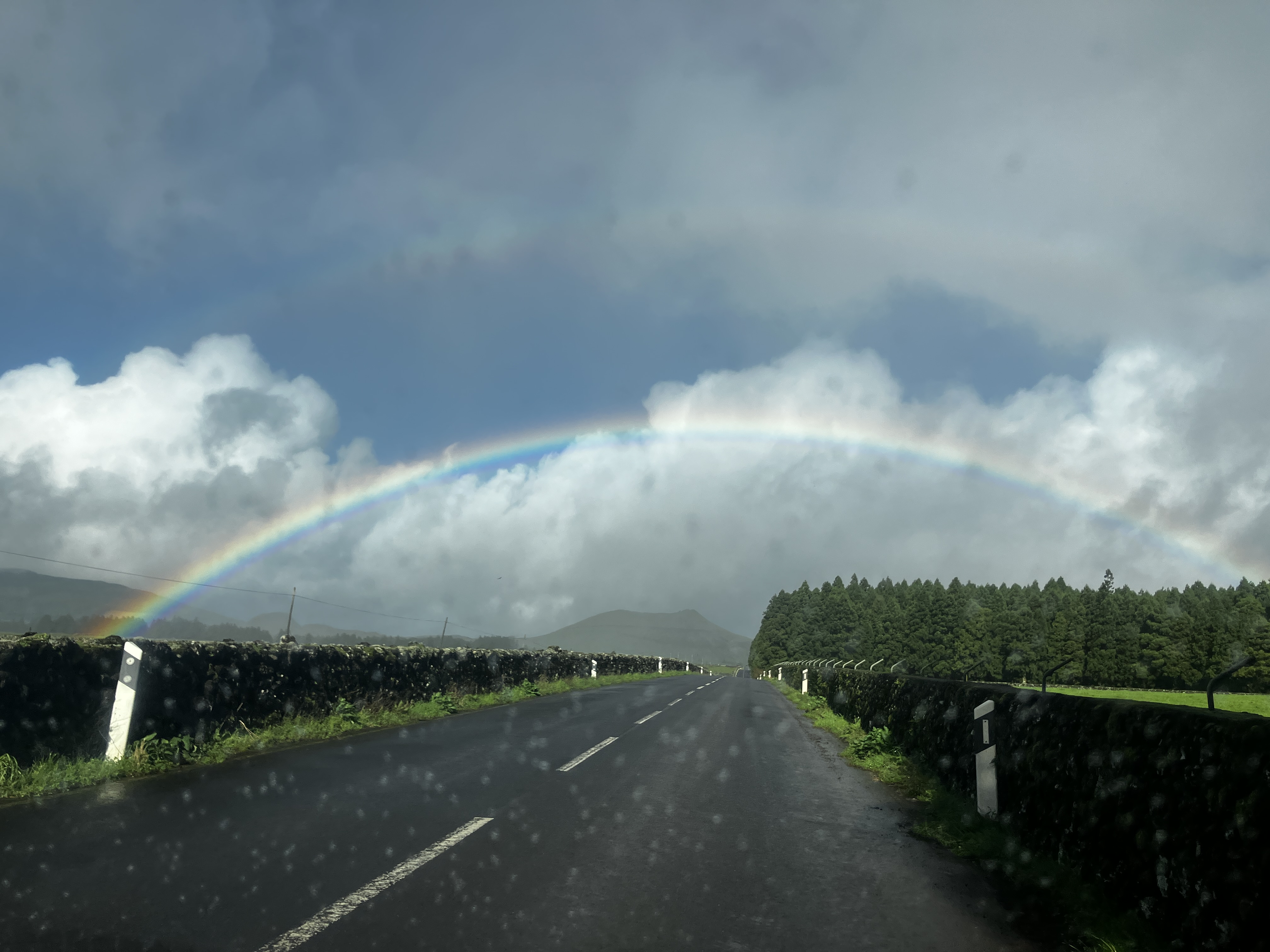 One of the simple pleasures of life here on Terceira is just driving around and seeing the sights. From a random horse-drawn cart, to countless fields of grazing cows, to otherworldly scenes of volcanic hills (cinder cones) and Japanese cedar forests, there is never a dull moment . Returning home one particular afternoon we even drove through a rainbow! Look closely at the lower-right photo – on a clear day from the southeast coast one can see the island of São Jorge (and sometimes Mount Pico on the island of Pico behind it, towering above).