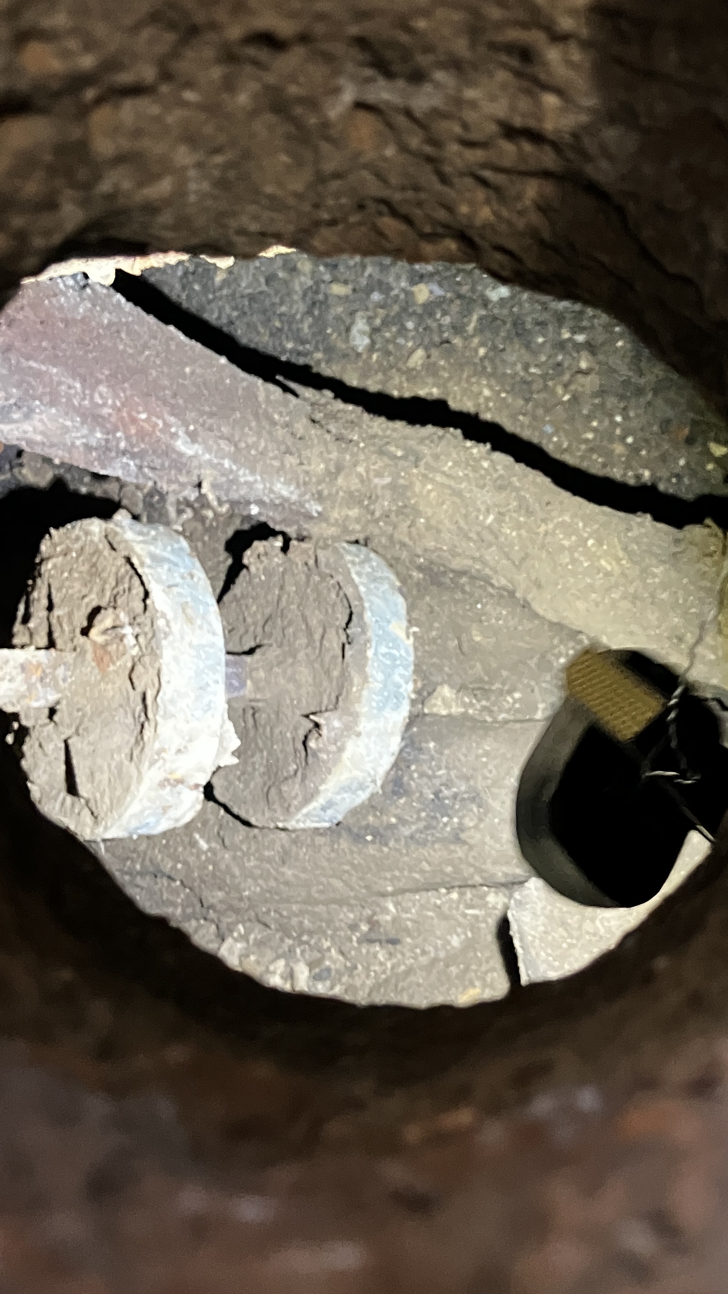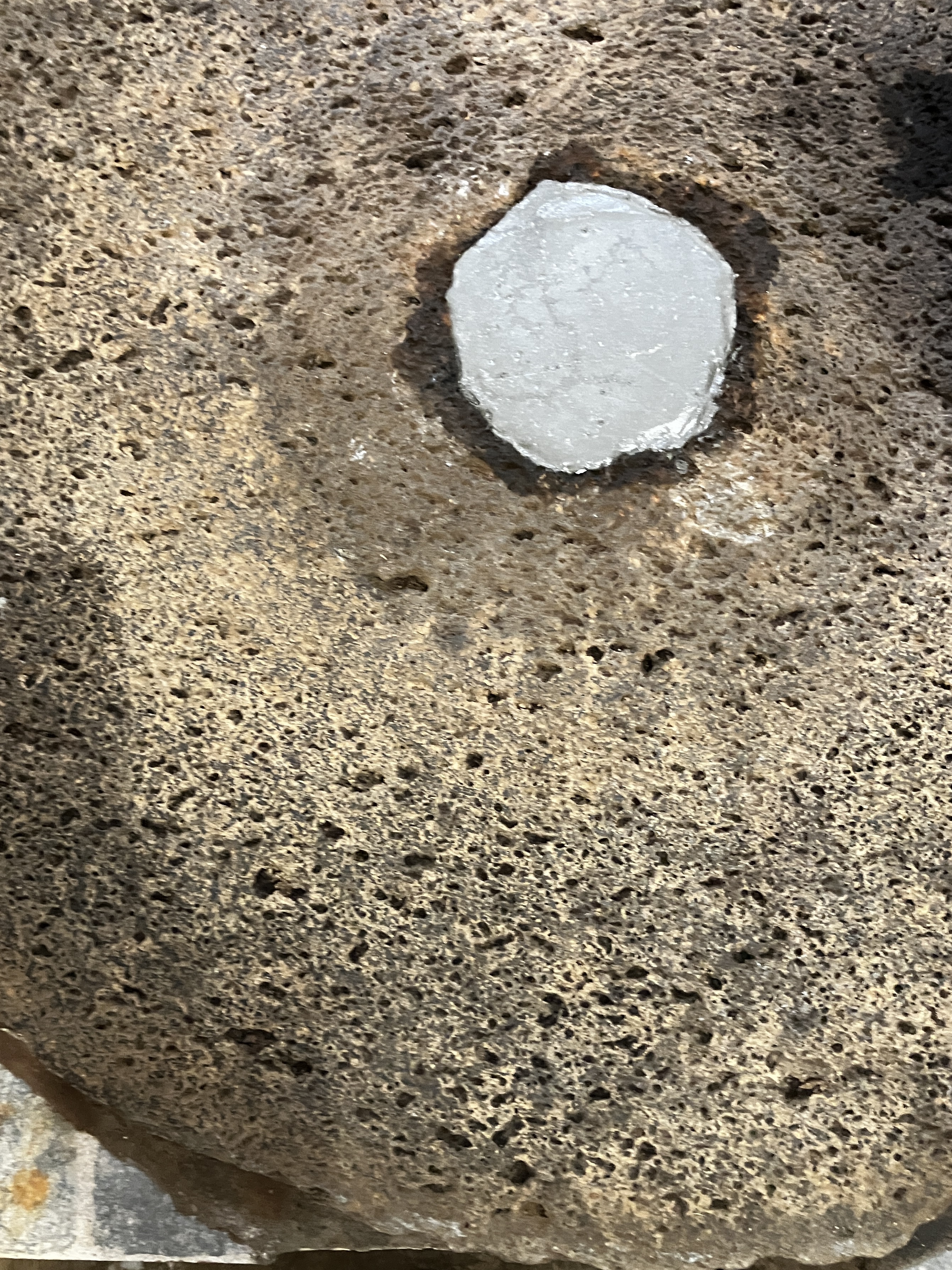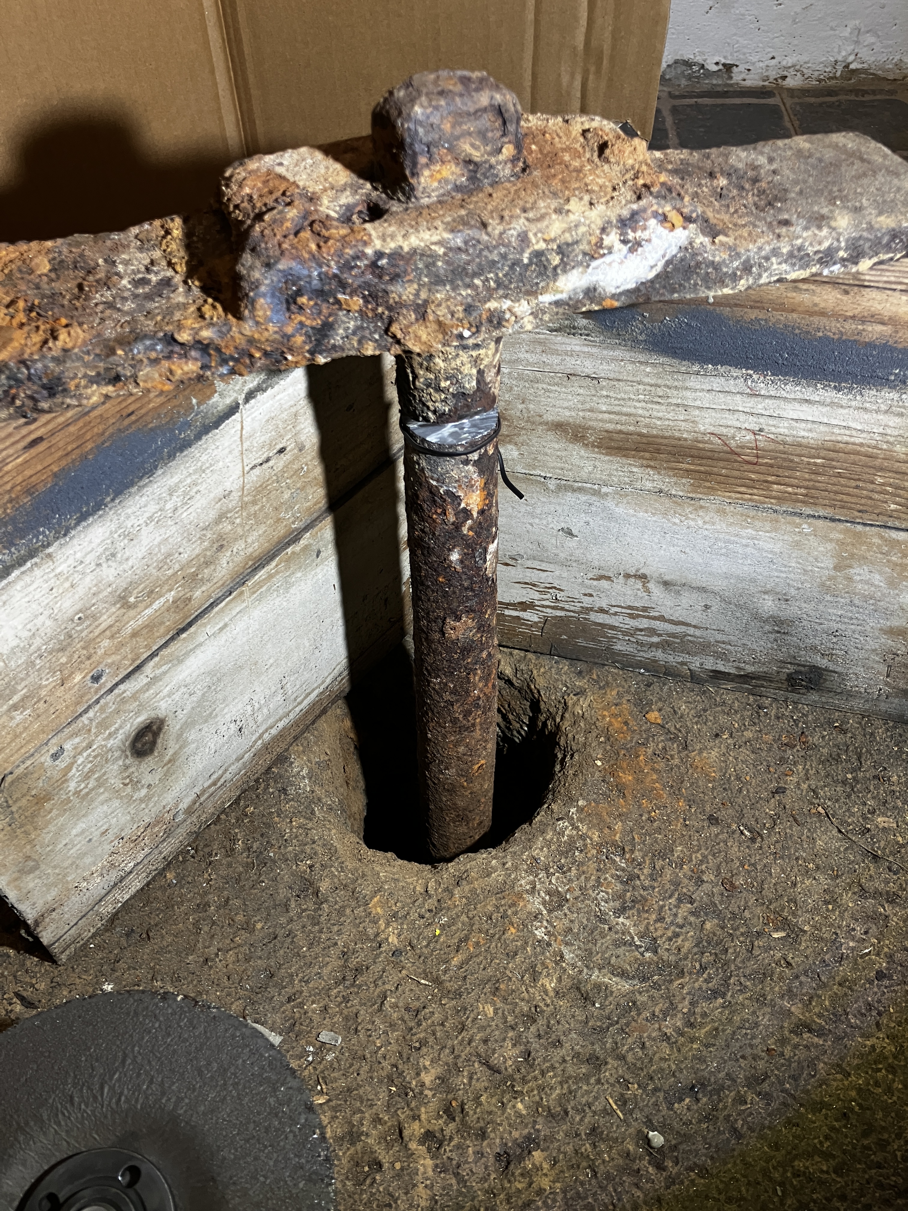 Continuing with our project to deconstruct the millstone, we needed to cut the rusted steel rod that once turned the (now removed) upper millstone. We were not able to pull it out as it was affixed to some apparatus below the floor. After considerable effort and sparks, we succeeded in cutting through the nearly 2-inch thick rod and dropped the mechanism to the chamber below. It would seem that at some point water flowed under the mill room and turned a water wheel in this lower chamber. Free from the rusted rod, we applied a layer of cement to seal up the center hole. No more musty drafts nor bugs in the laundry room!