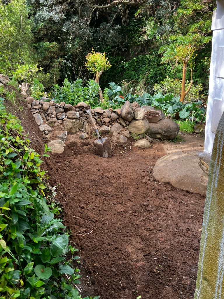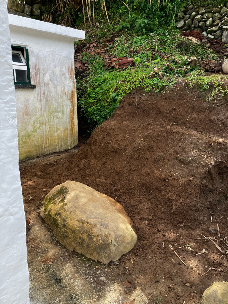 Bottom photo: a view of the removed terrace from behind the bathroom. Once the retention wall is built on the left, we would like to cover the new space to use it as an open-air garden shed (and perhaps one day expand the bathroom).