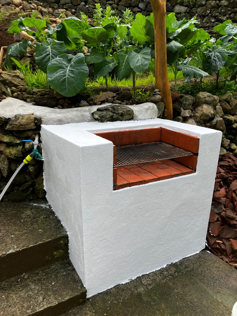 Top row: overgrown stone wall and bbq, Lukus painting the bbq, final result with collards growing on terrace above