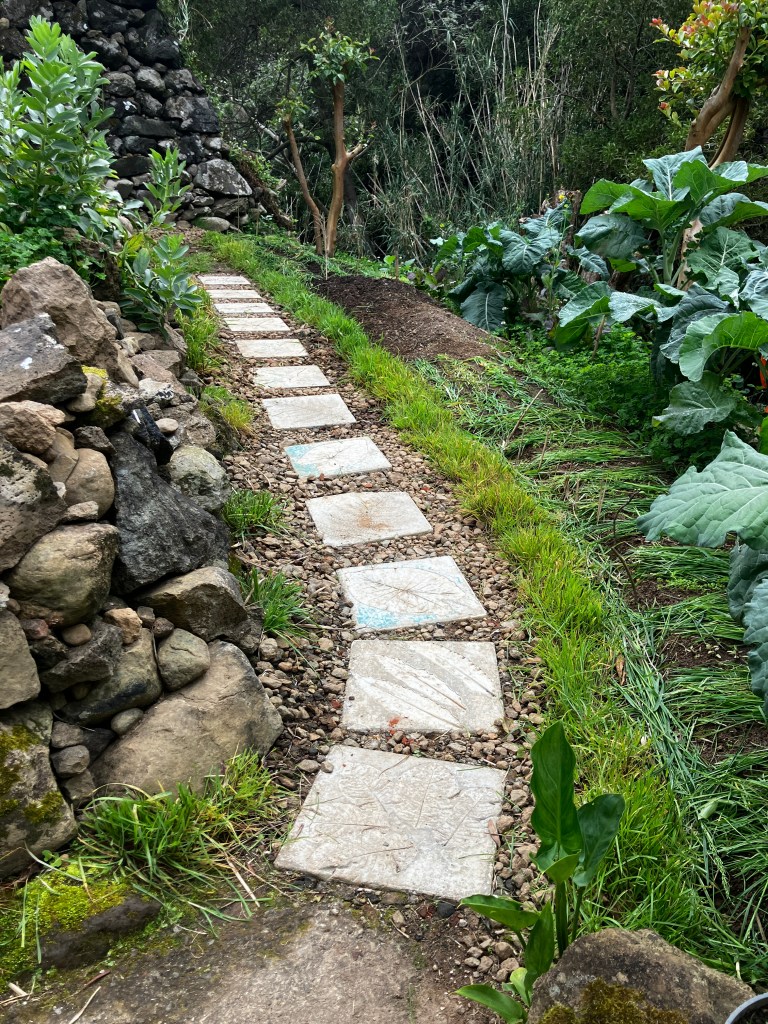 Top row: the very overgrown hillside, the new stone wall extending from the boulder in photo #1 and Raymond placing patio blocks in the lower terrace, newly trimmed grass along the patio blocks – sprouts of carrots and beets on the right and newly planted black-eyed peas at the back.