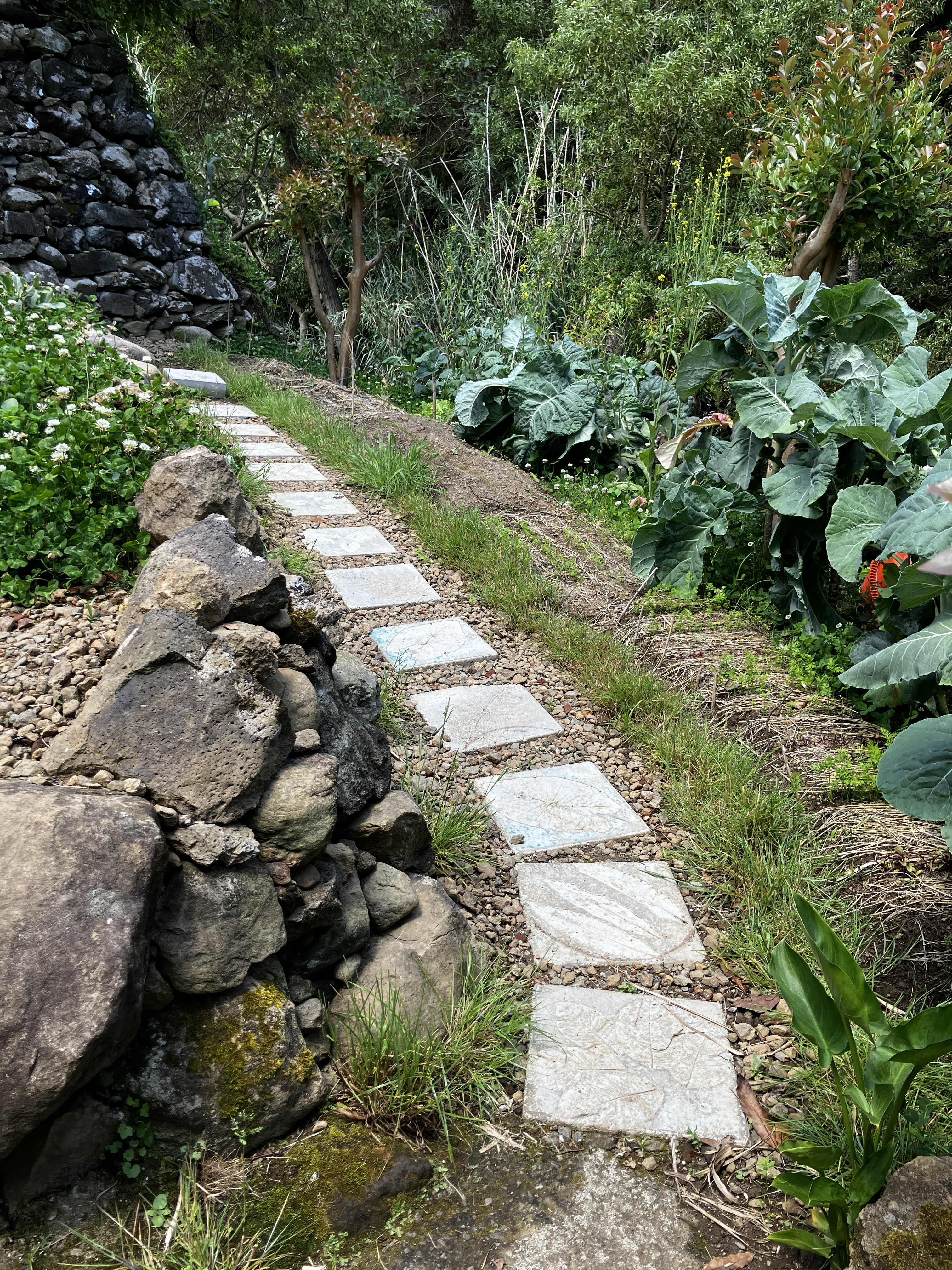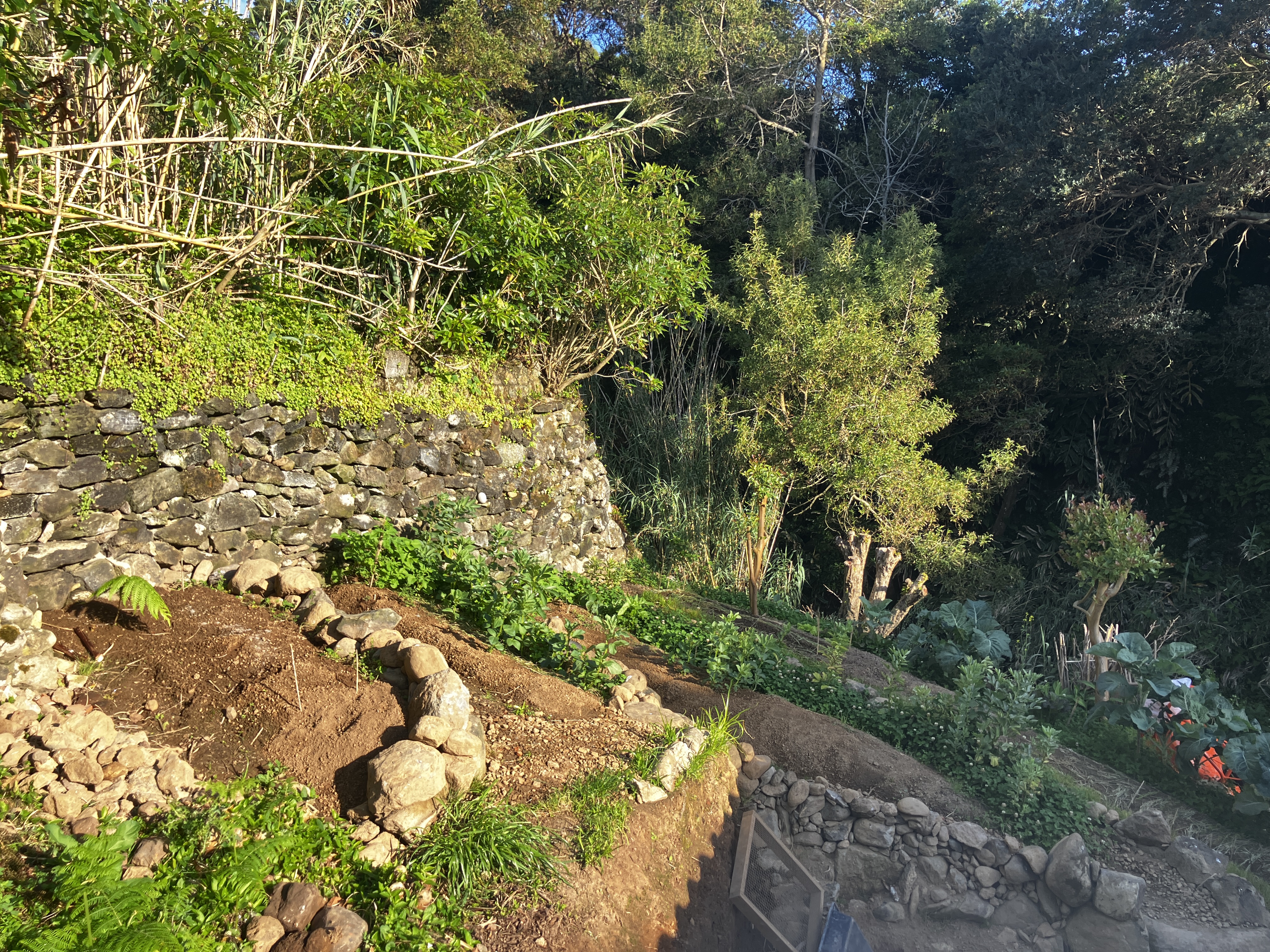 Looking at the first photo (taken from atop our bathroom roof) one can see the four levels of the terraces: squash and a transplanted tree fern on the uppermost; tomatoes and favas on the next down; potatoes, leeks, and newly planted black-eyed peas on the next; and carrots, beets, and collards on the lowest. The last two photos are of the morning sun on the ‘high bridge’ over our stream and looking back at our house and the rock wall along our driveway.