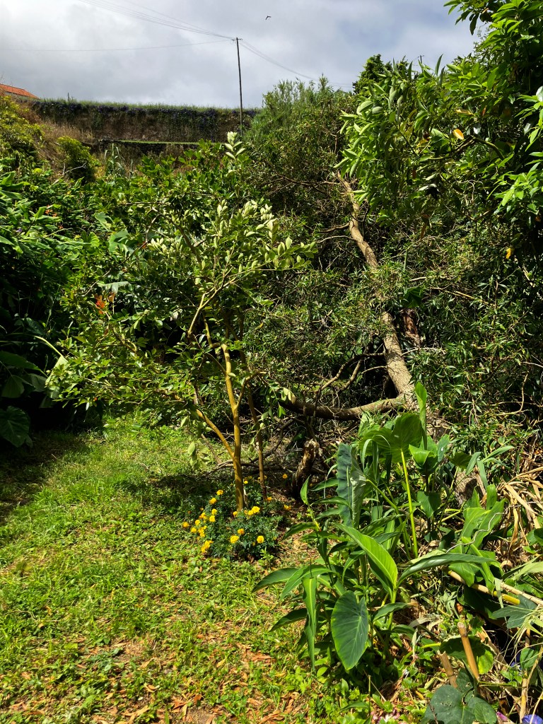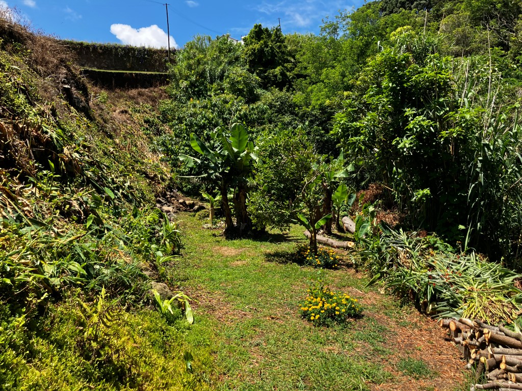 In an effort to bring more sun to the orchard, we cut down a few trees growing along the banks of our stream. First down was a tall Australian blackwood tree that unfortunately fell on a banana tree, destroying its bunch of bananas. Next down was a nightshade tree (also Australian, also invasive) that is an especially troublesome tree here – their brittle branches break easily and, along with their leaves, are covered with irritating hairs that cause a rash (they also smell like gasoline…). Lastly we cut down a smaller blackwood tree that was shading the passionfruit vine and the terrace. With some additional cutting back of the wild cannas we had planted (on the left) and our neighbor cleaning up his hillside, the yard is feeling really open and airy!