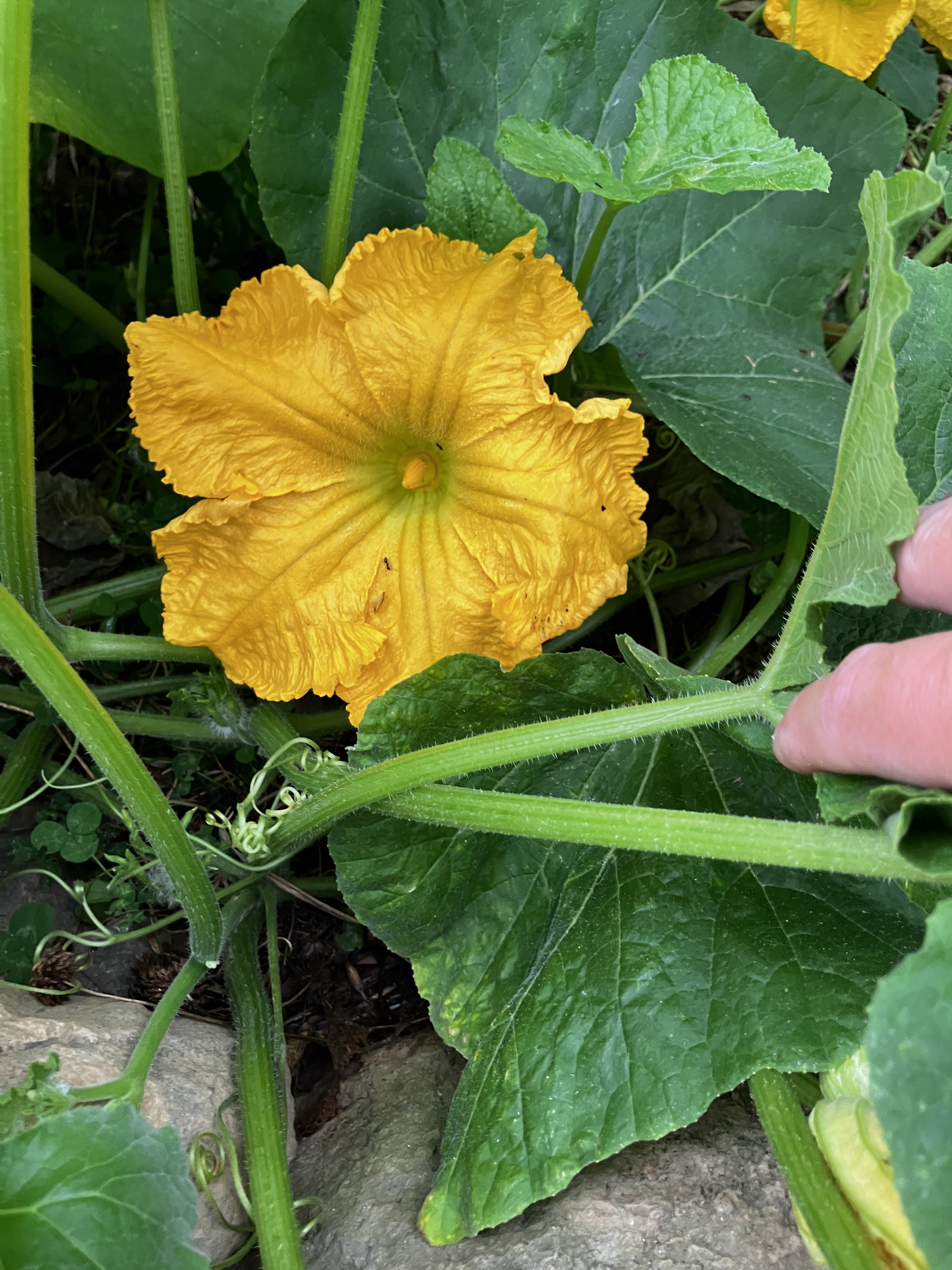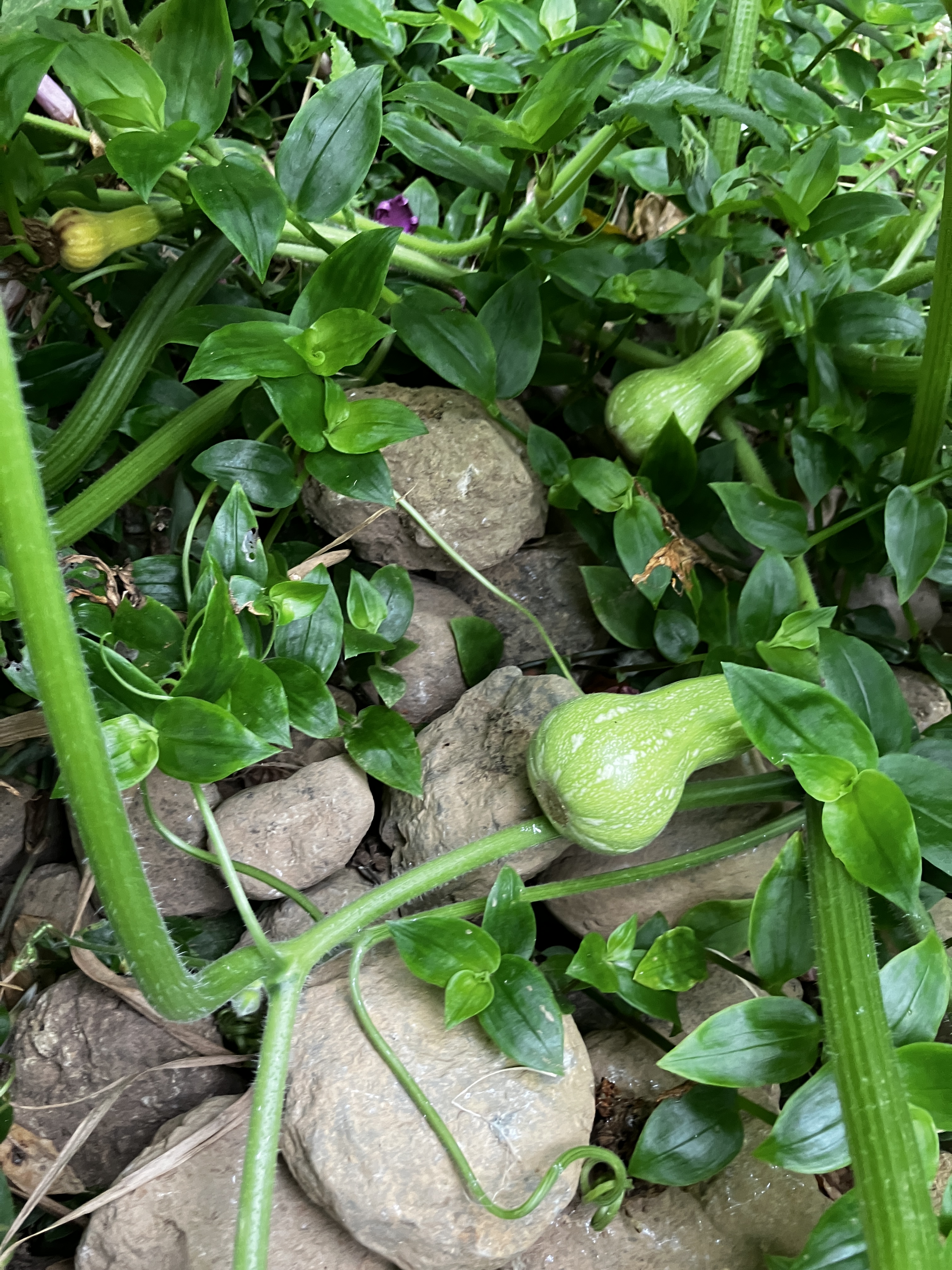 Our little watermelon patch is doing really well! We planted them around the stump of the “cherry” tree we cut down last year (we have since learned it was actually a plum tree). The butternut squash are taking shape on the uppermost terrace – it’s unbelievable how large the vines are! The collards have been cut back to provide more light for the beets and carrots in the lower terrace, while the black-eyed peas are vining like crazy on the middle terrace, and some yellow pear tomatoes are ripening on the upper terrace. Lastly, the fig tree has really taken off in the last month or two. It has lots of new leaves and a few side branches forming.