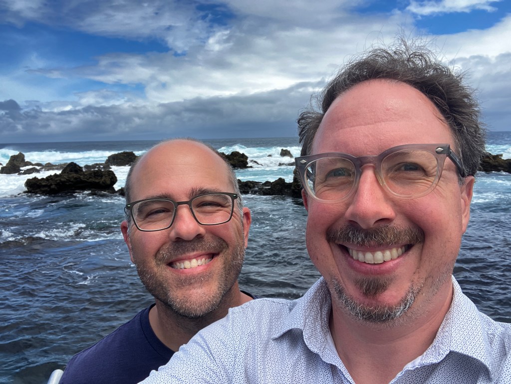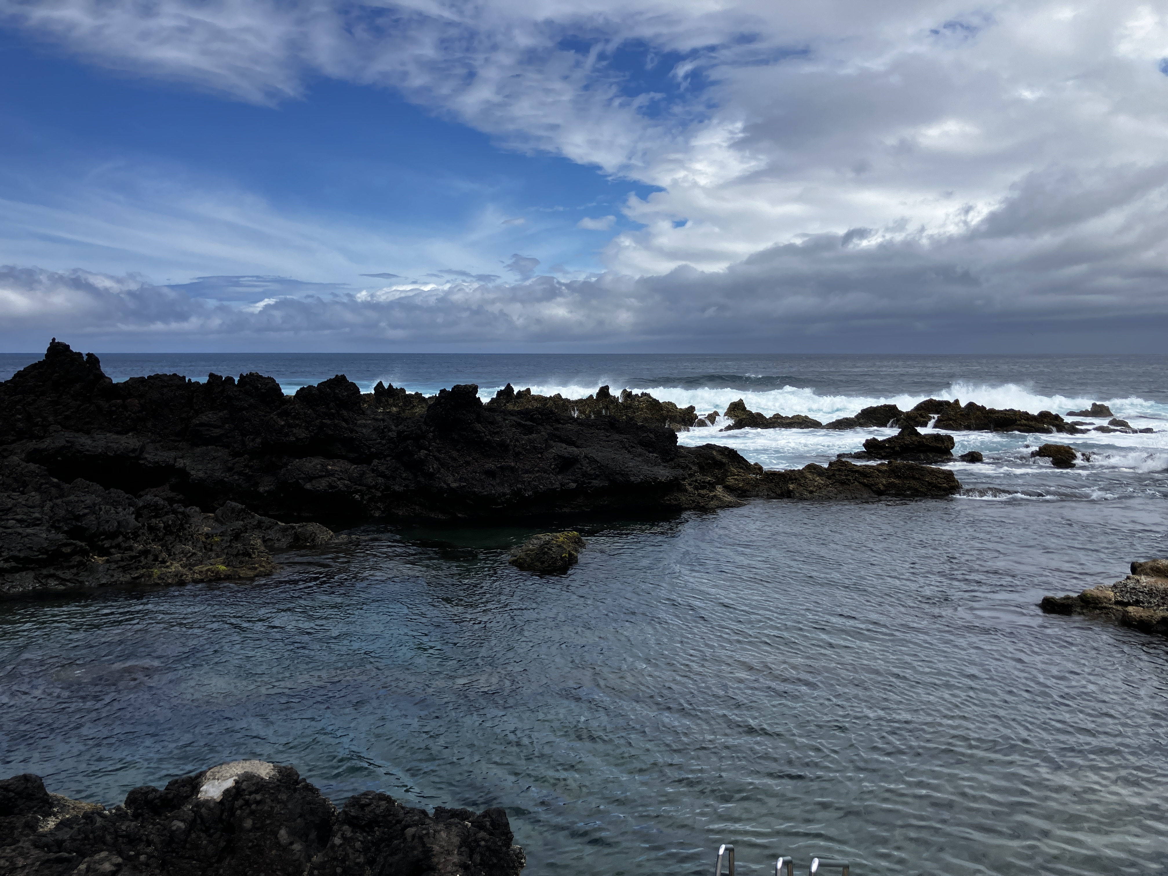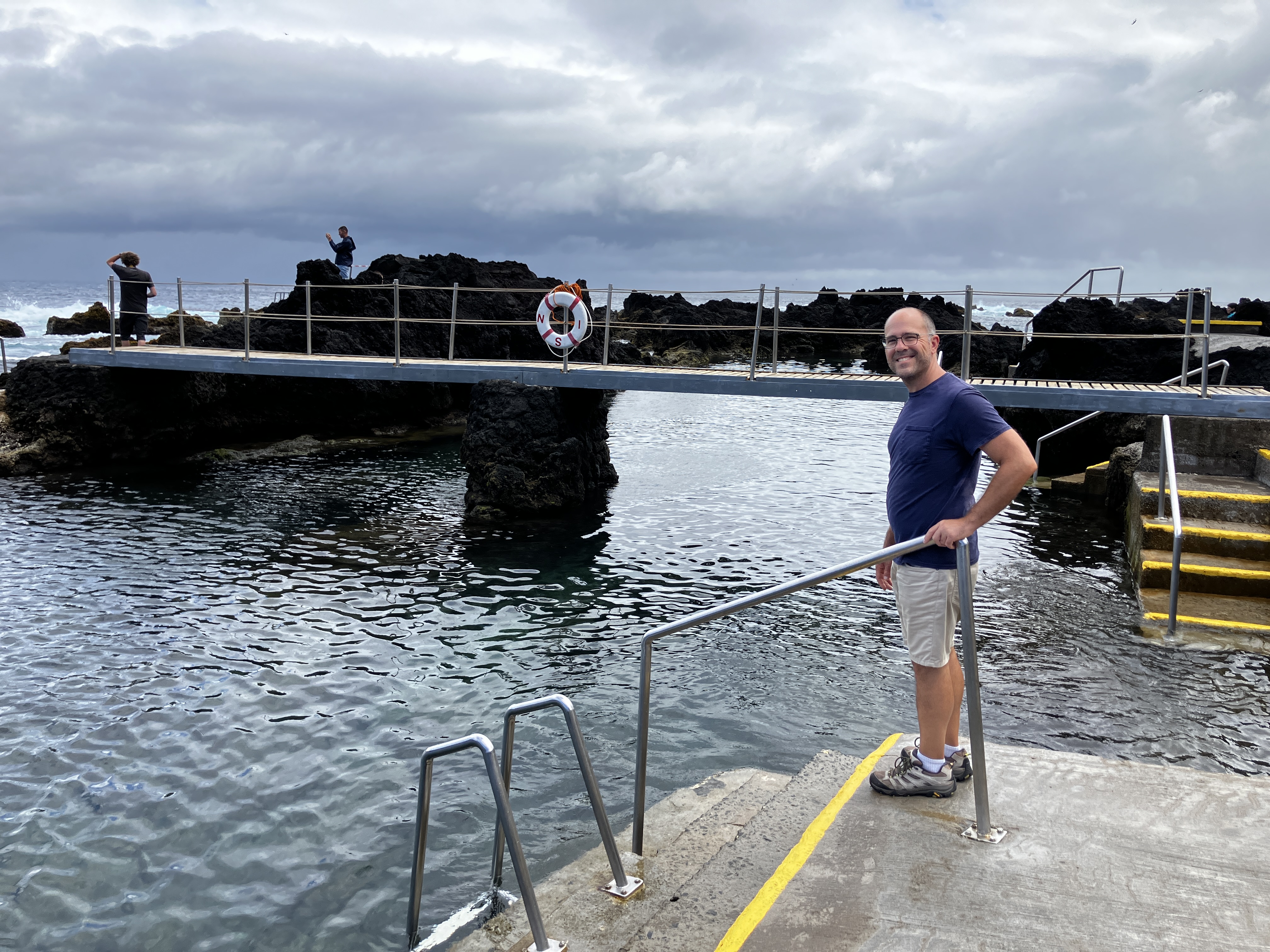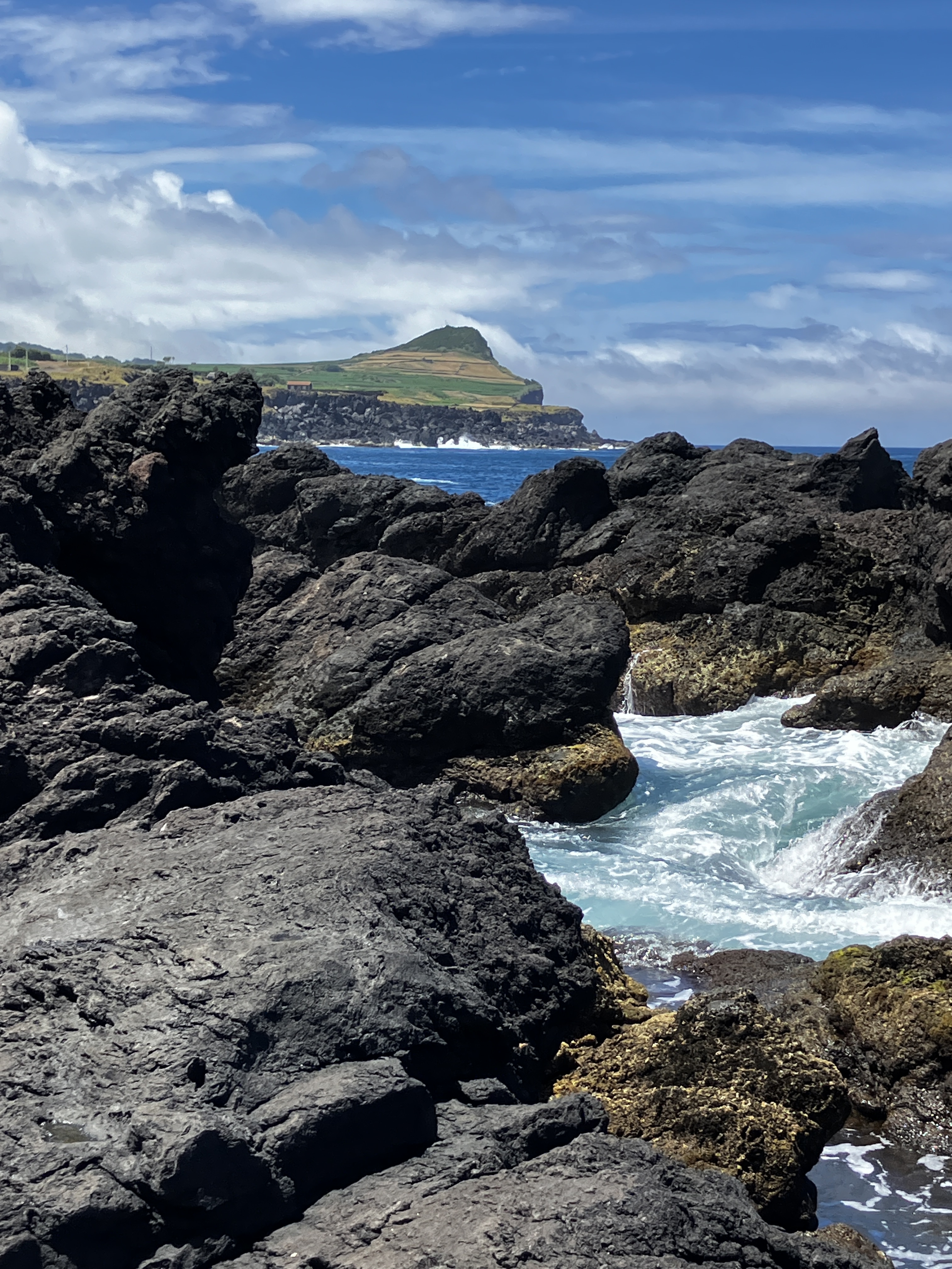 The above photos are from the swimming area in the neighboring village of Biscoitos. Despite having visited many times through the year it has been amazing to see it come to life in the summer – more sea life, more shades of blue, more tourists. Even the novelty of walking across the plank bridge to further lava field swimming areas. We are proud to share that we FINALLY jumped from the high ledge into the “Belo Abismo” (beautiful abyss) area that consists of a channel 24-30 feet deep that cuts through the lava rocks and allows for some spectacular diving (below: Raymond and his mother there back in April).