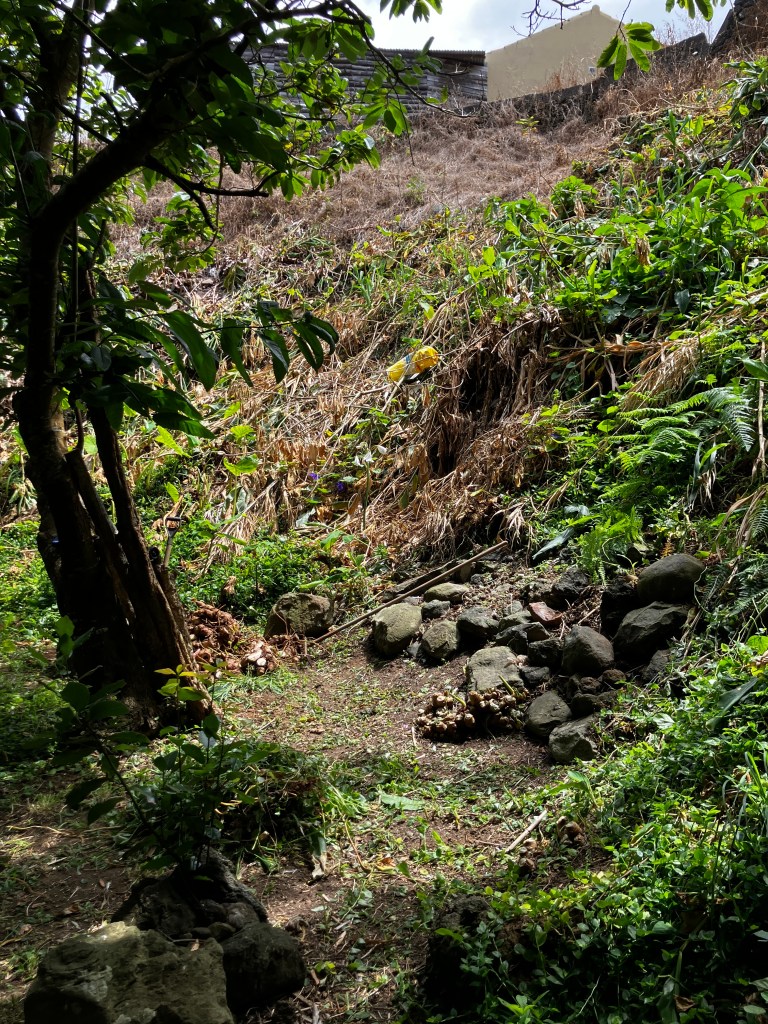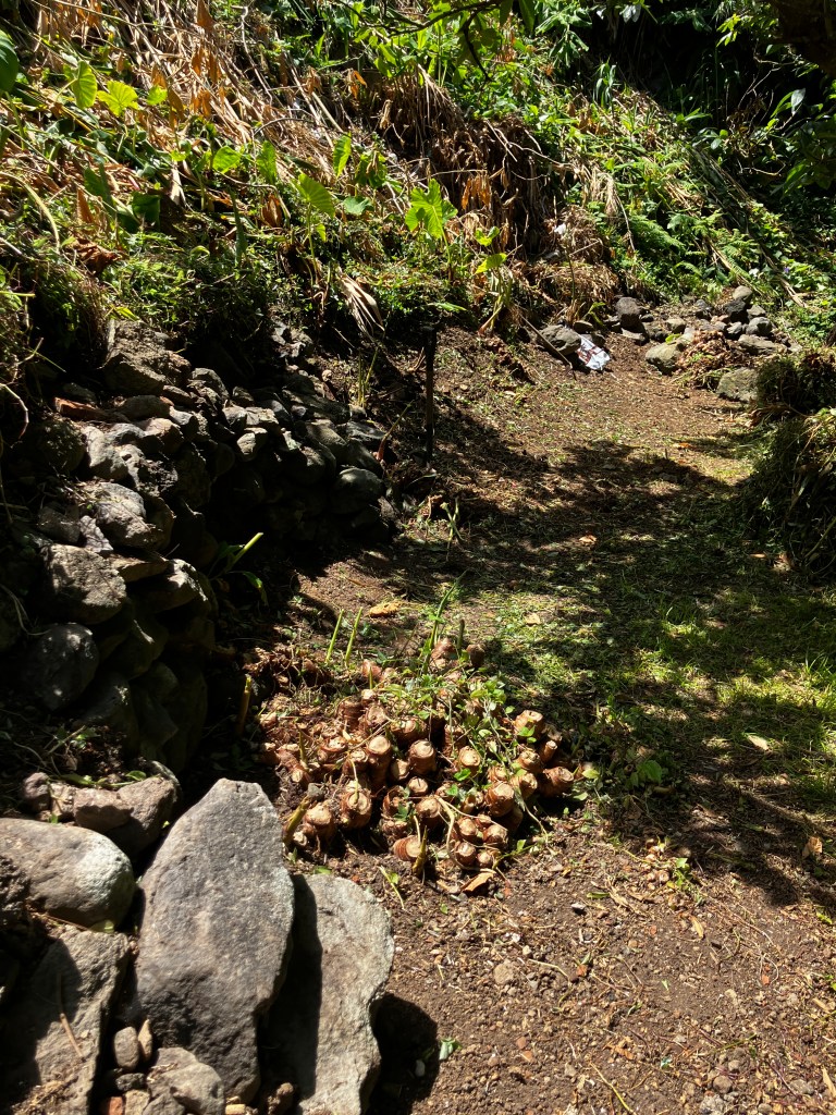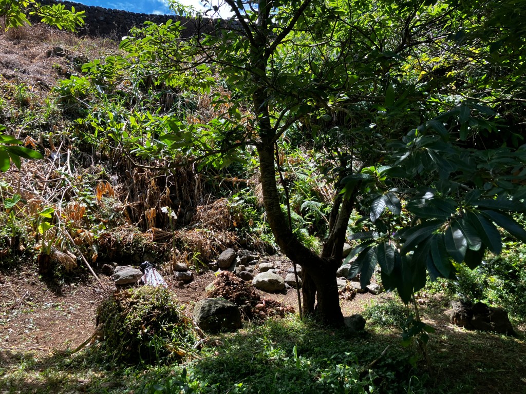 The property line with the neighbor’s hillside is not well defined along the orchard. There is evidence of an old stone wall but it was overgrown with vines and collapsed in places. It has been a lot of work clearing the vines, digging up mounds of invasive ginger, and consolidating rocks. We are looking forward to continuing the rebuilt wall section, completed last Fall, all the way to the back of the property.