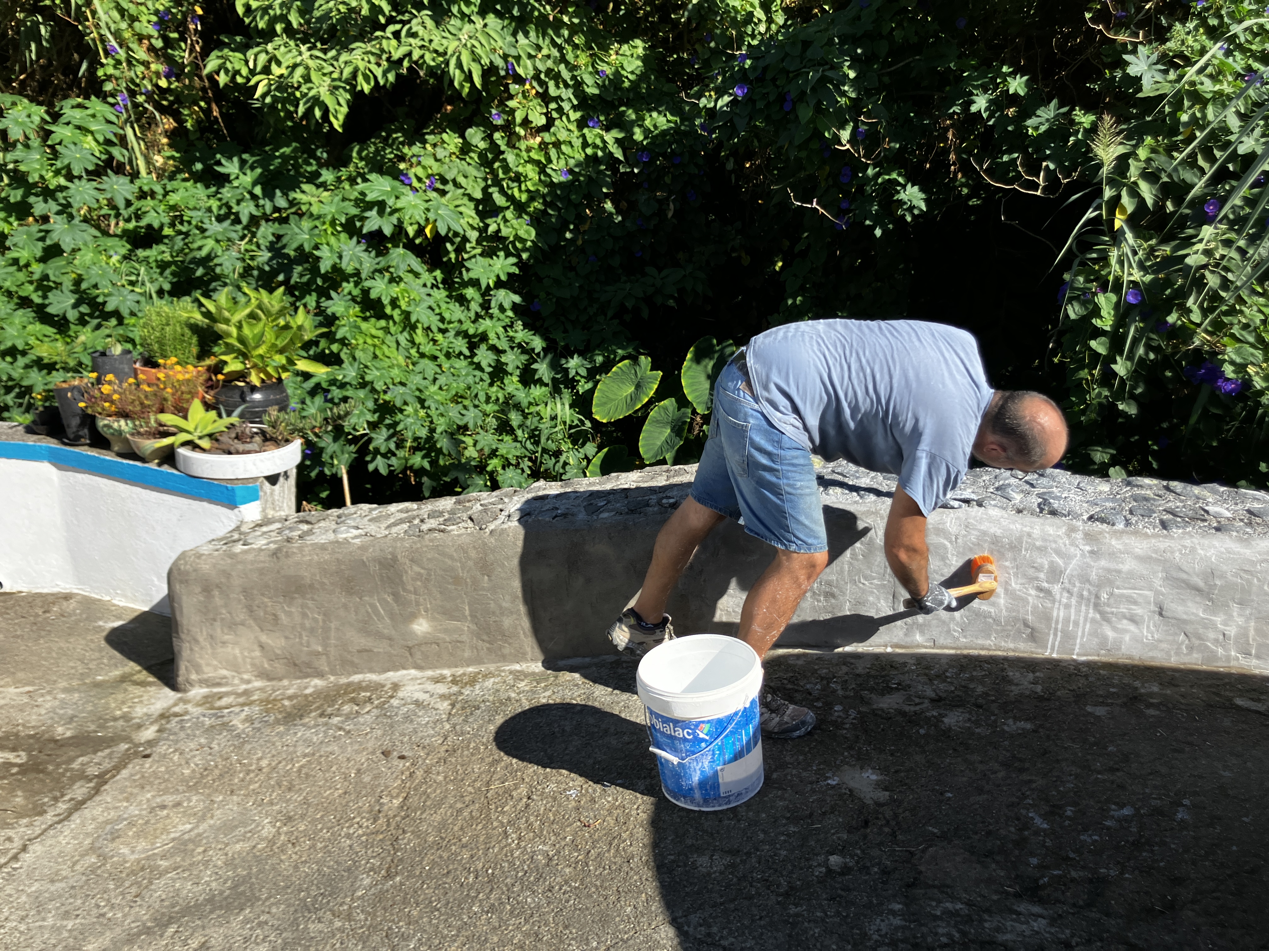 After stuccoing the stone wall of the driveway, Raymond suggested applying whitewash instead of paint. He did some research and realized that now, while the cement is fresh, would be the perfect time to try this traditional method. So for 1/20 the cost of a big bucket of paint, he bought a 50 pound sack of lime. Just mix with water and apply the whitewash thinly (and again, and again…). Raymond has so far applied 5 coats and the wall keeps getting brighter and brighter. Aside from the price savings, lime is also non-polluting, anti-mildew (to hopefully keep the moss and lichen at bay), and actually soaks into cement further hardening it.