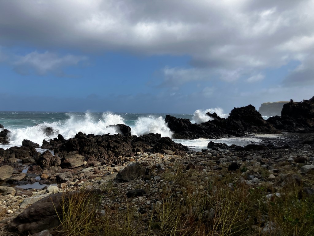 Ah – the return of the dark and stormy North Atlantic. As beautiful as the sea and sky were in the summer, that brief season has passed and the great grayness of winter is now upon us. When the undistinguishable sea/sky is broken only by distant white caps and occasional breaks of blue. When the thunderous sound of waves crashing resonates in our house and yard. The reality is that this moody scene was so common over the past year that its return feels like a homecoming. Summer is for tourists…this is the real Terceira!