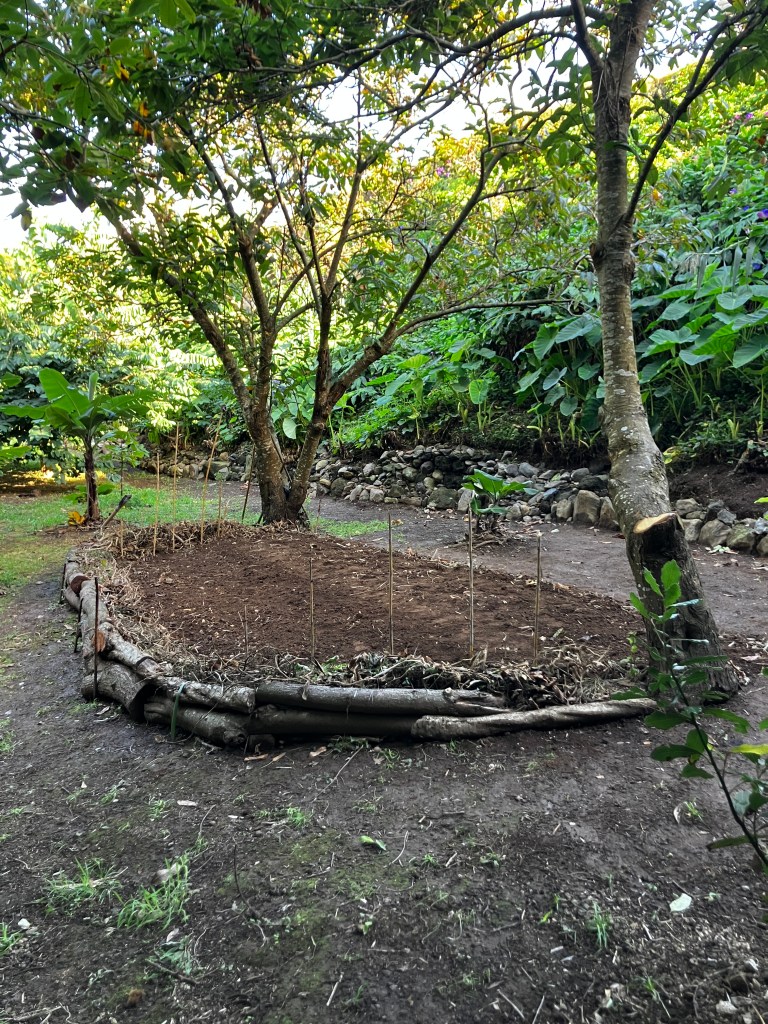 The back garden between the chestnut trees freshly planted with fava beans.