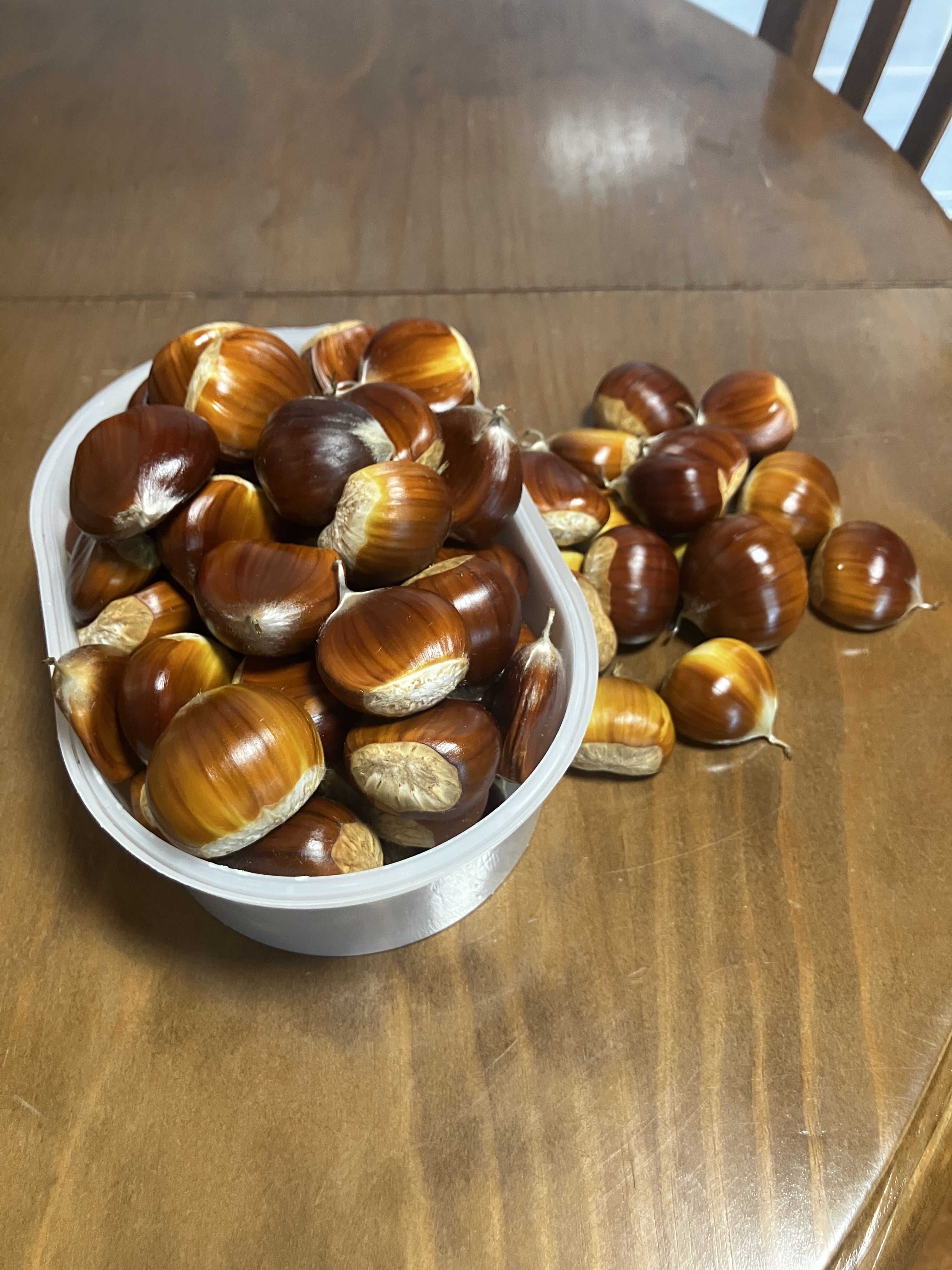 So…what do we do with the finished peeled nuts? We’ve tried cooking them all kinds of ways. A favorite is simply sautรฉed with some olive oil and salt, but we also made a French cream of chestnut soup (gray and kind of bland), sautรฉed them with butter and brown sugar, and have tried candying in sugar syrup. At this point, we’re starting to freeze the peeled nuts due to gathering more than we can consume.