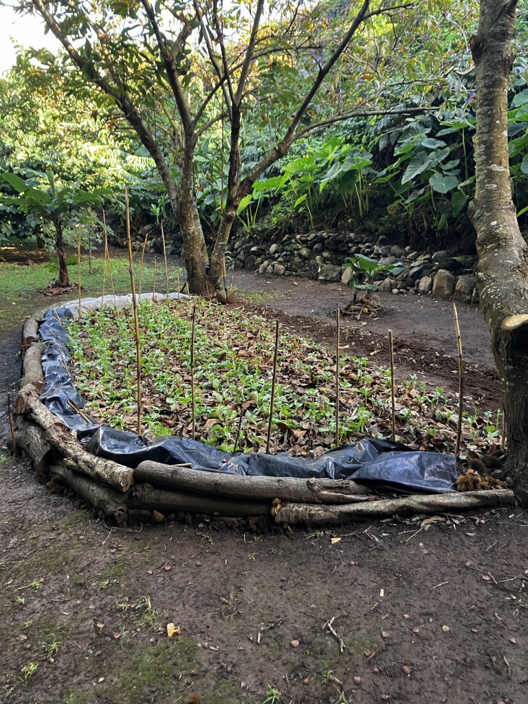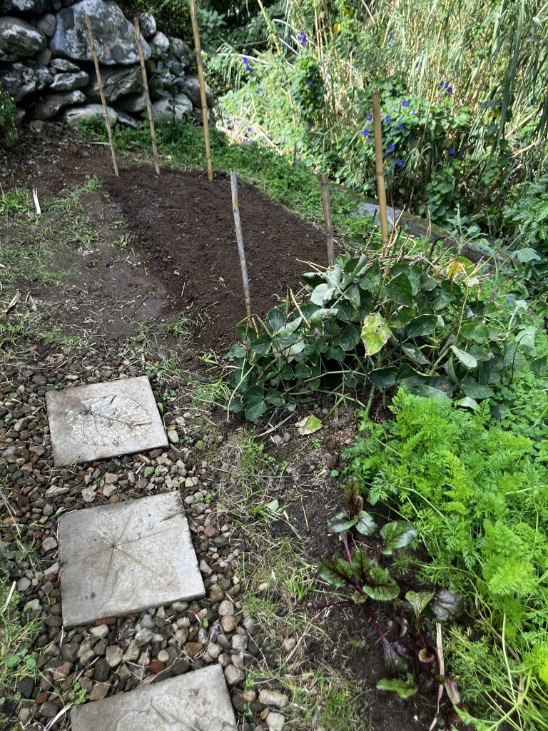 In the terraced garden near the house we are still harvesting beets and carrots (and occasionally black-eyed peas from a grouping that seems to have found its second wind). We replanted more beets, along with lettuce, in the near half of the lower terrace and dug up and transplanted an araçal tree to make way for an expanded planting of carrots in the far half. In the middle terrace the potatoes are doing well and the leeks are ever-so-slowly reaching maturity (I need to start replanting there as well to replenish what we’ve harvested).