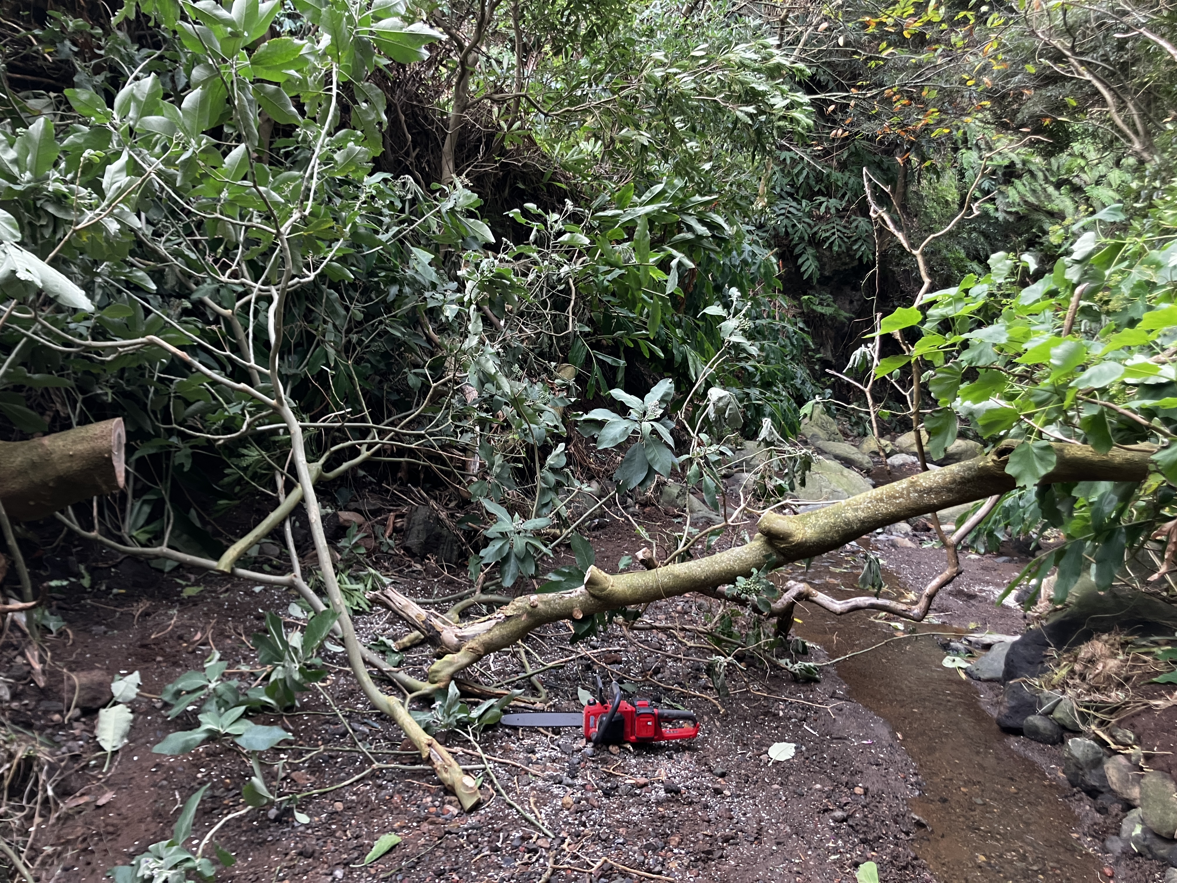 We also did some cleanup along the stream, sawing down six invasive nightshade trees. A few had fallen across the stream and needed removing, and the rest were simply garbage trees that are easy to despise (our neighbor told us that they are locally known as “crap trees”). Aside from being rather messy with weak branches that break easily, their leaves reek of kerosene and shed irritating hairs when disturbed. Raymond and I can see the difference in the tree line above the stream – so much more space and light for everything else now.