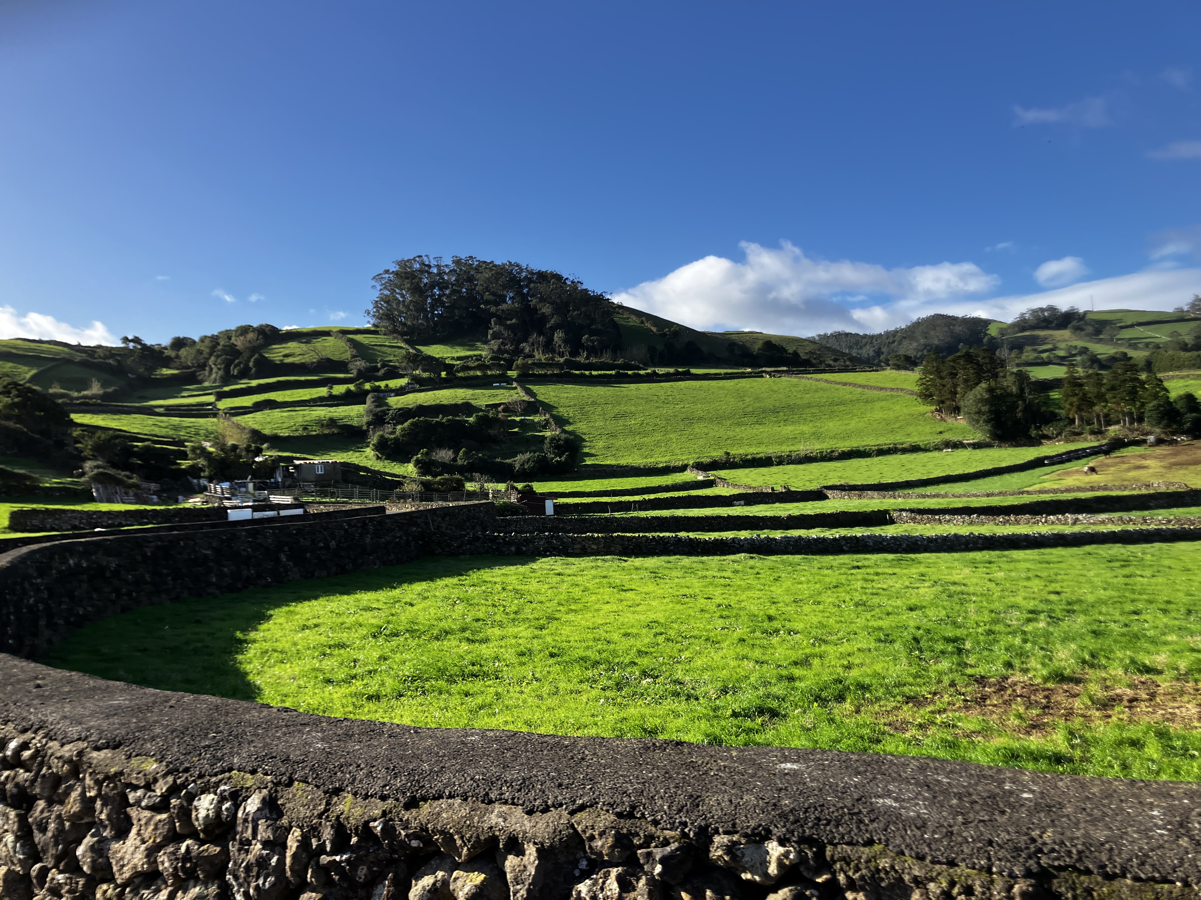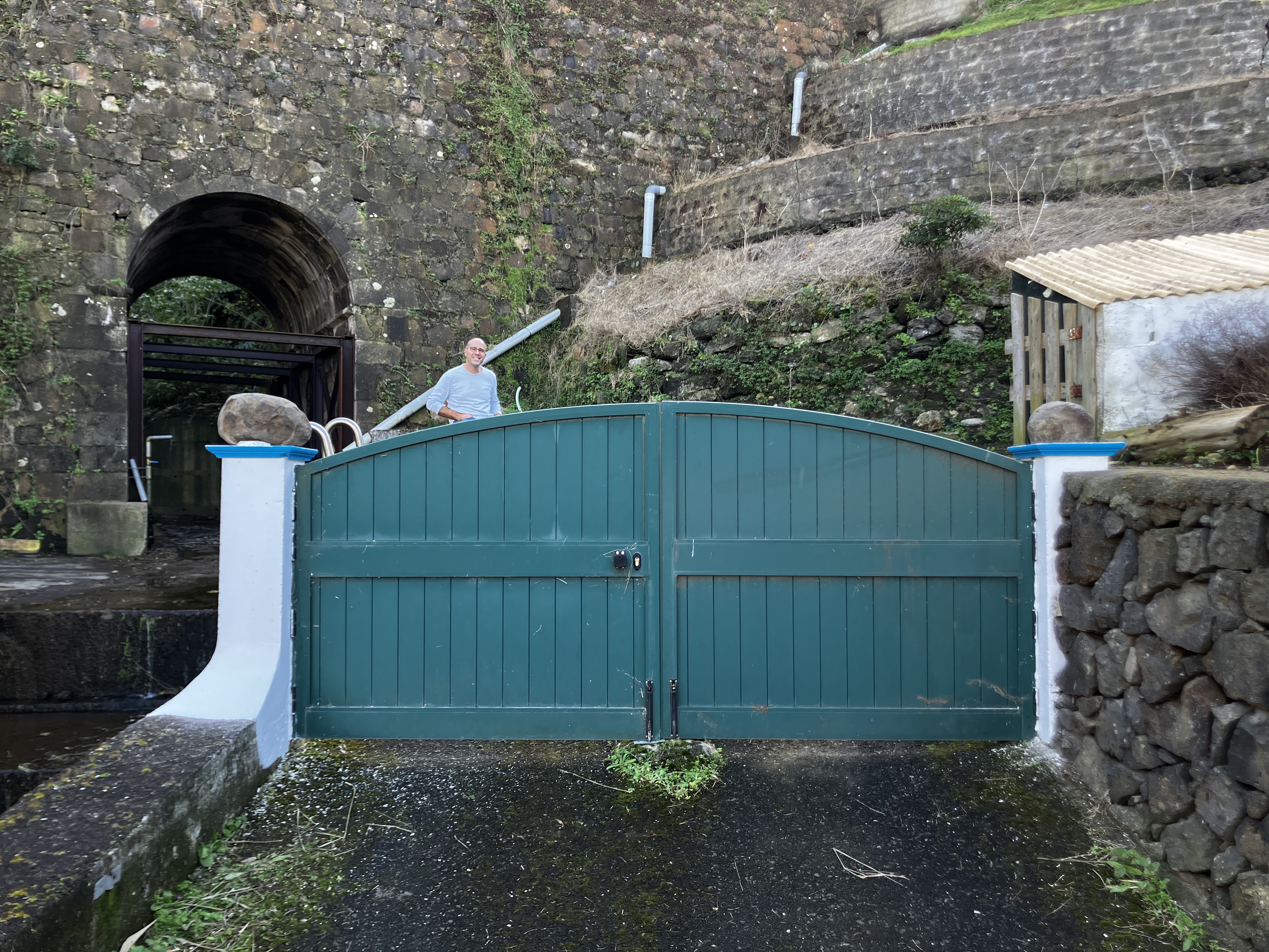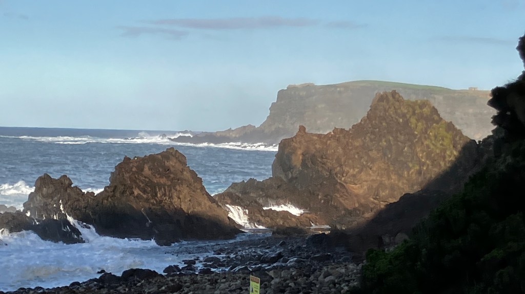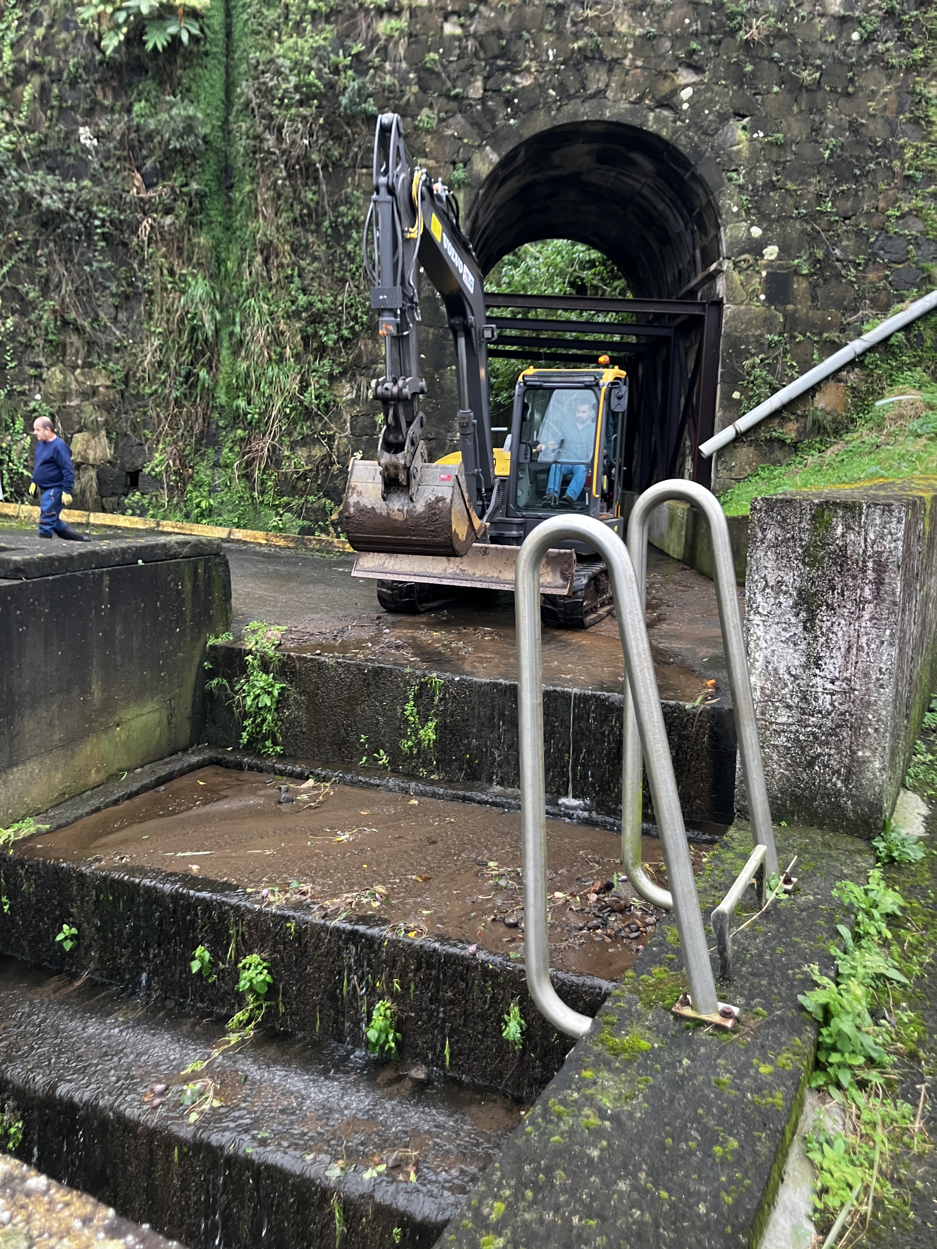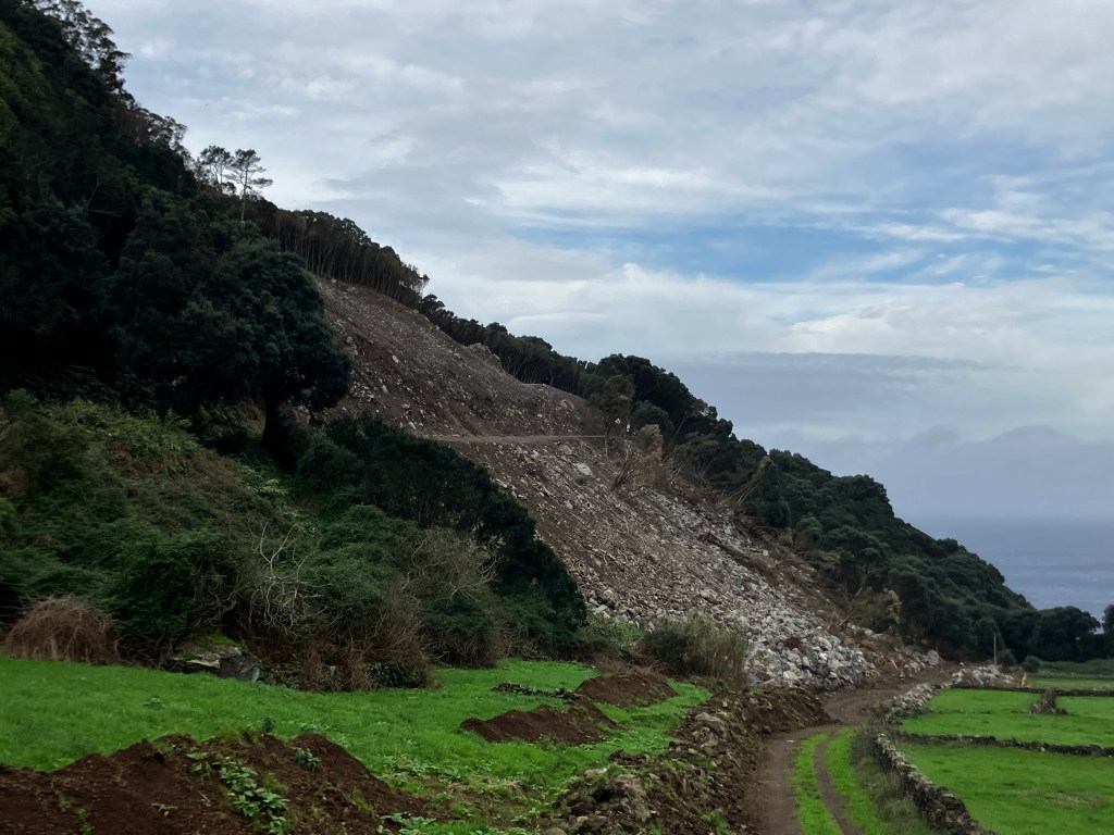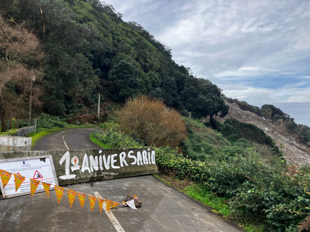 January 14 was the anniversary of the 4.5 earthquake that struck Terceira last year. Thankfully our house and yard were unharmed (and we were on the mainland at the time) but unfortunately the only road that goes along the northwest corner of the island was damaged by fallen boulders and deemed unsafe. It has been closed for a year now (the barricade was painted with “first anniversary”) and is quite a point of contention in island politics. The second photo shows the hillside newly bulldozed in an effort to keep boulders from falling into the road. Still no word as to when the route around the island will reopen…