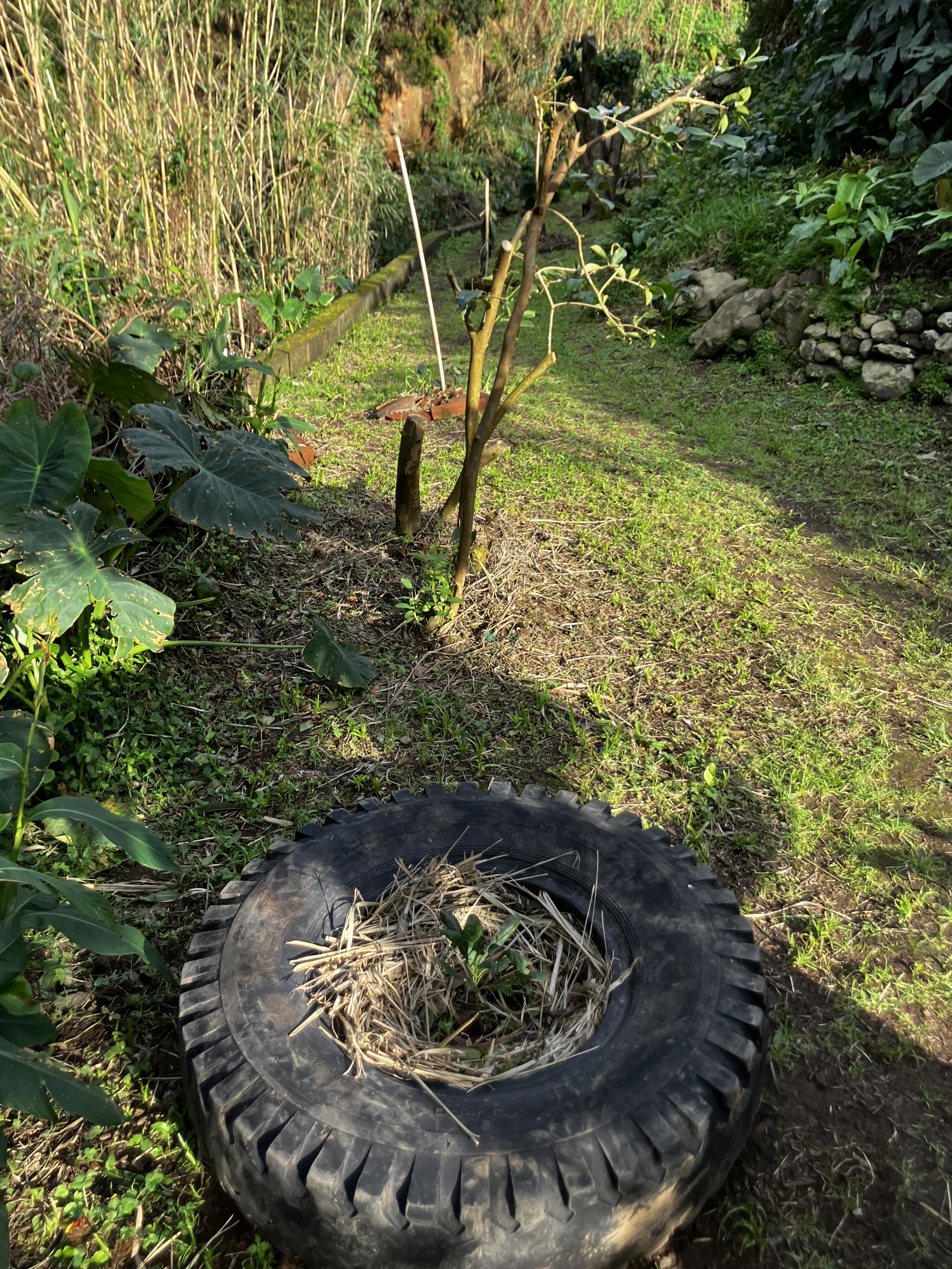 We found a large truck tire across the stream and repurposed it to create a raised bed of sorts around the little avocado tree. The bonus is this seems to have stopped the birds from scratching away at the mulch and dirt every morning.