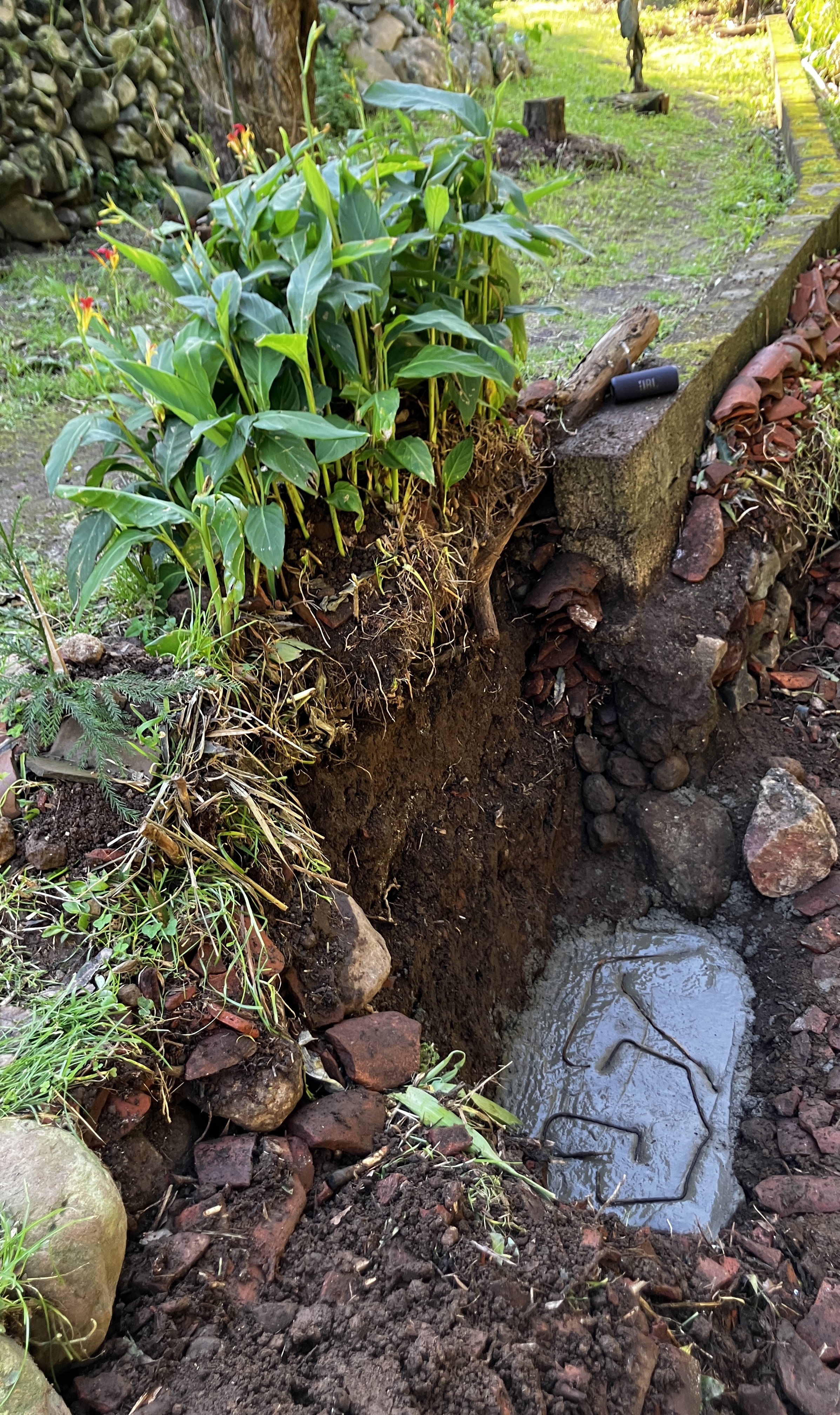 Closer to the house, we started to properly fix the missing retaining wall near grill. The rubble, dirt, leaves, and branches we’ve dumped there were only a temporary measure, and, if not for the wild cannas we planted, the walkway to our backyard would have long eroded away. So I raked out the leaves and branches and dug out a space for a new wall foundation. The existing wall was made with rocks topped with concrete and cinder block so we are aspiring to match it. Raymond had the great suggestion to pour a concrete pad first for an extra bit of stability (seen above between batch #1 and batch #2 with rebar placed). Thankfully all the rocks we needed were nearby in and around the stream. Concrete and cinder blocks coming soon!