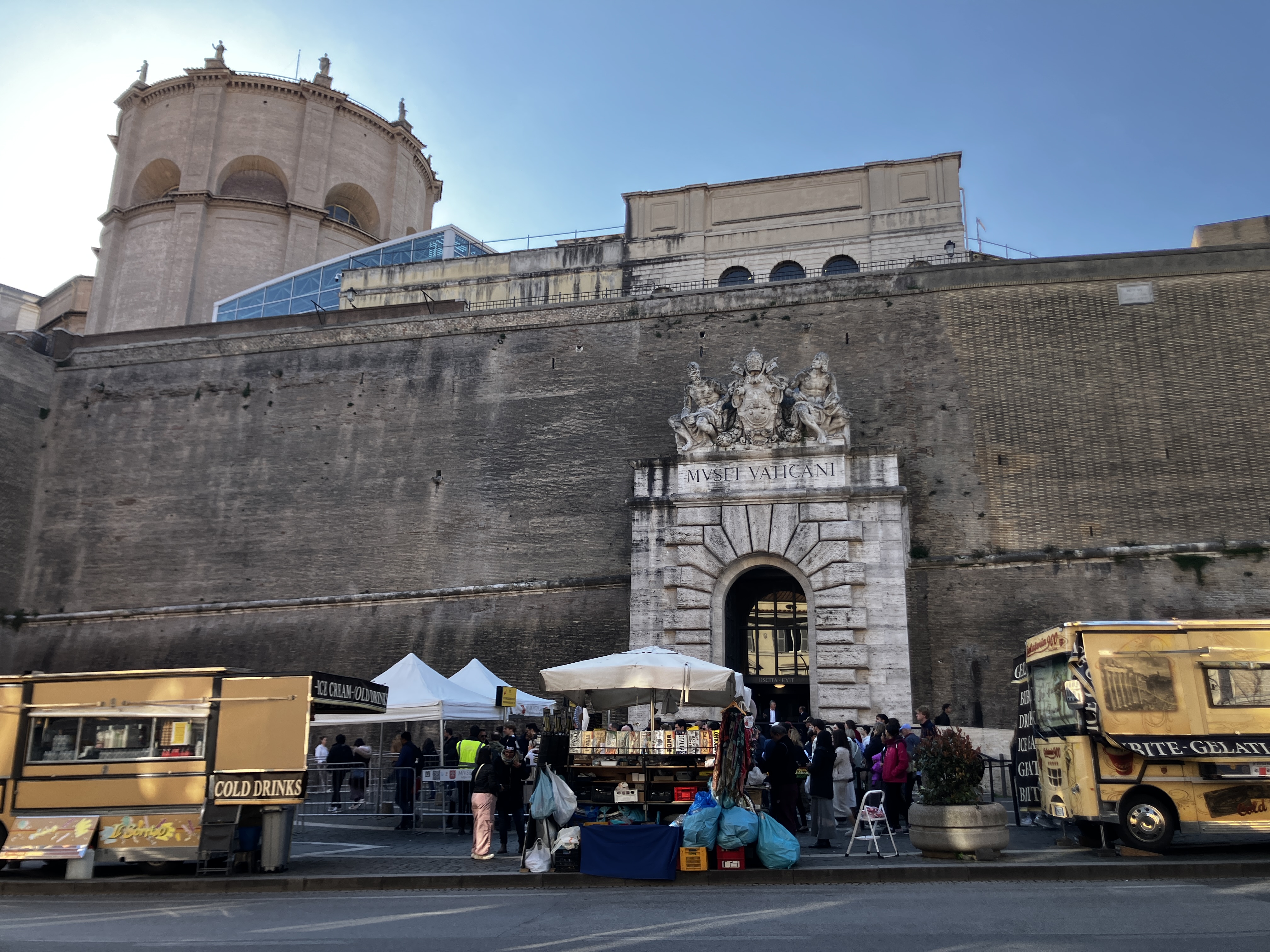 After arriving from a very late flight from Lisbon (midnight) we found a reputable taxi driver that did not overcharge us for the ride into Rome. We stayed at a lovey Air BnB apartment (top left: view from the living room). It had everything we needed for a comfortable stay and lots of character – only about 1/3 mile north of Vatican City. After sleeping-in, our first day was spend exploring the neighborhood and walking across St. Peter’s Square (not mention sending some postcards from the Vatican Post!). Next we proceeded to circumnavigate the entire nation of Vatican City by following its large and lengthy wall.