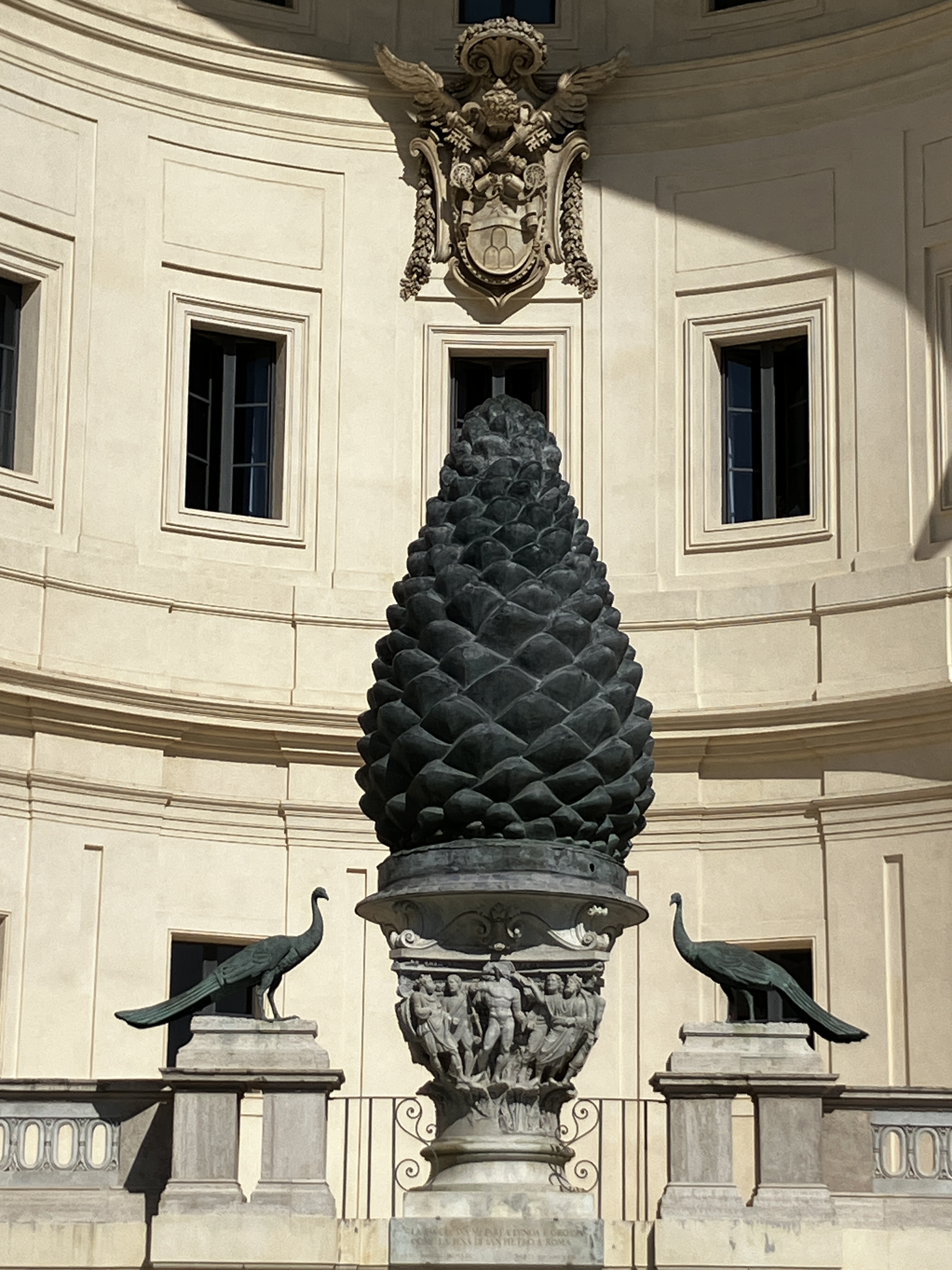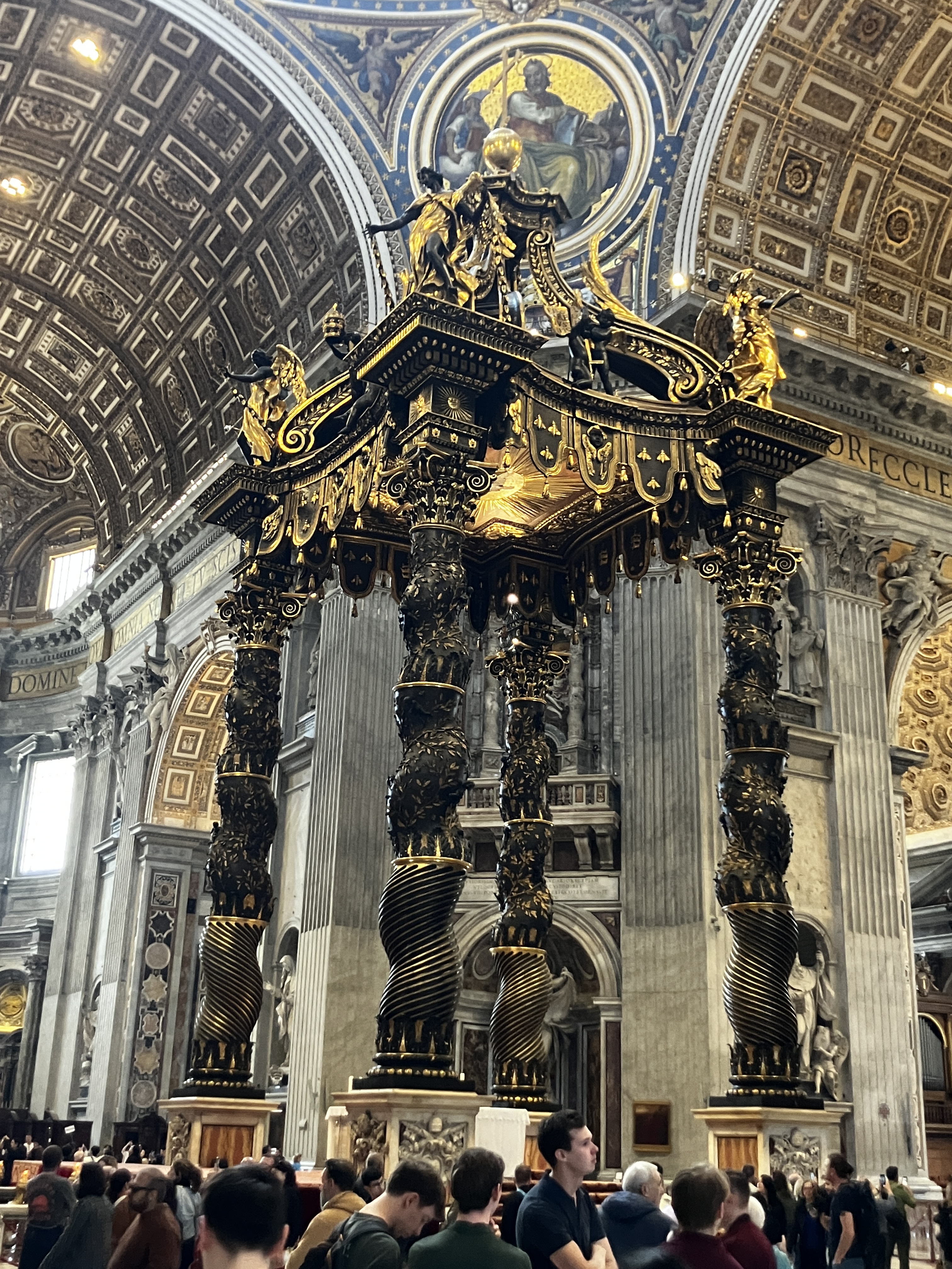 The three of us got an early start on our second day and had an espresso while waiting for our tour of the Vatican Museum, Sistine Chapel, and St. Peter’s Basilica. Nothing prepares you for the magnitude of grandeur and the scale of the Vatican – our guided tour was three hours and should have been three DAYS…there is simply so much to see that it, unfortunately, felt a bit rushed at times to keep up with our group (all the while shoulder-to-shoulder with a multitude of other tour groups – our guide said there are something like 30,000 people who visit the Vatican museum each day). The sculptures were amazing and the highlights for me were the giant Roman bronze pine cone and statue of Apollo (later used by Michelangelo as inspiration for the face of Jesus in the Sistine Chapel), the pair of Egyptian lions, and the gallery of incredibly realistic animal statues. The other highlight, of course, was St. Peter’s Basilica – the capital of the Catholic world. The opulence and beauty of this place cannot be overstated – marble literally everywhere: columns, floors, statues, and everything else gilded. Plus the famous sculpture la Pietà which Michelangelo created from a single block of marble at the age of 24 (above, lower left). The altar canopy was also a show stopper (above, lower right).