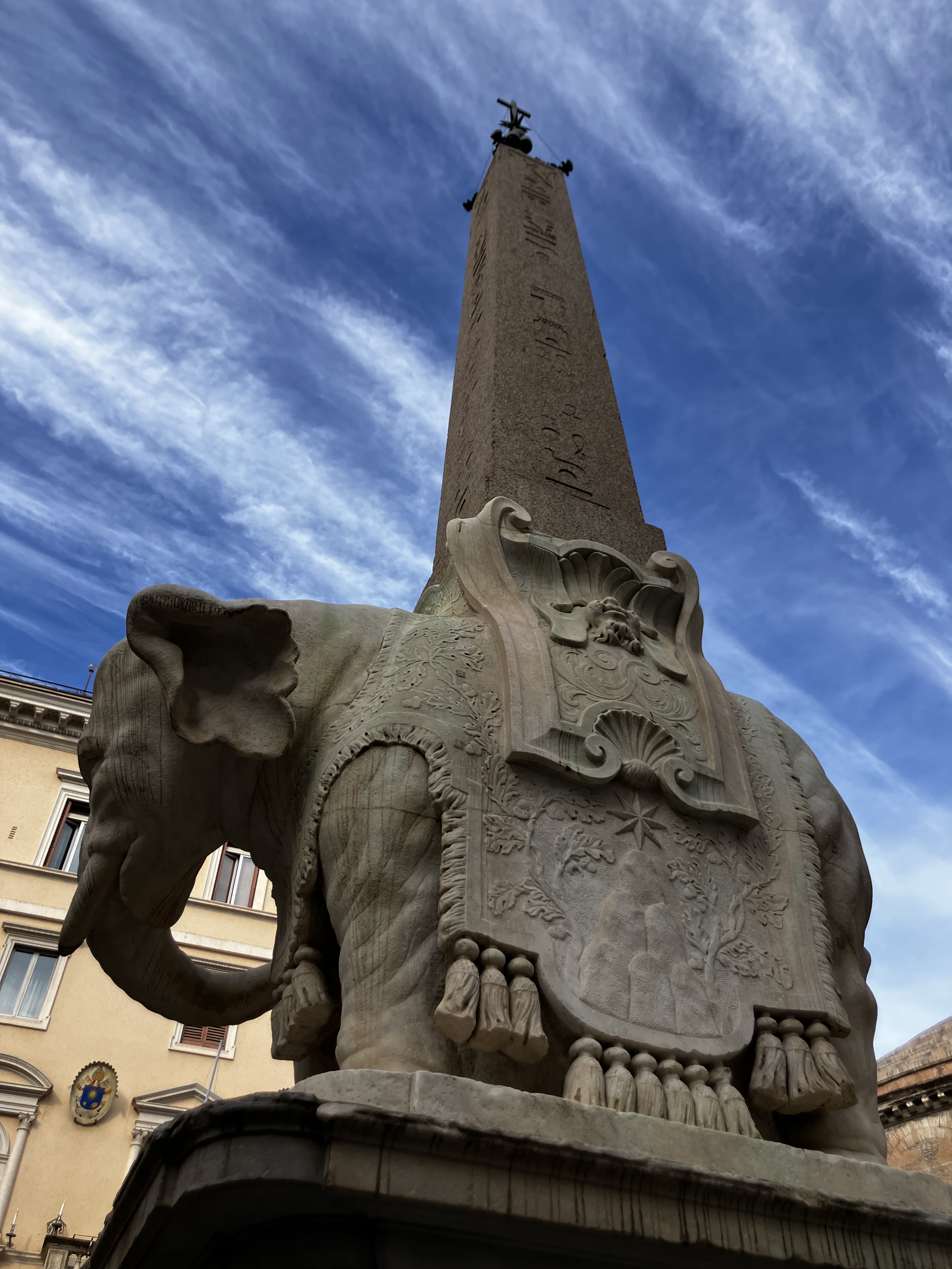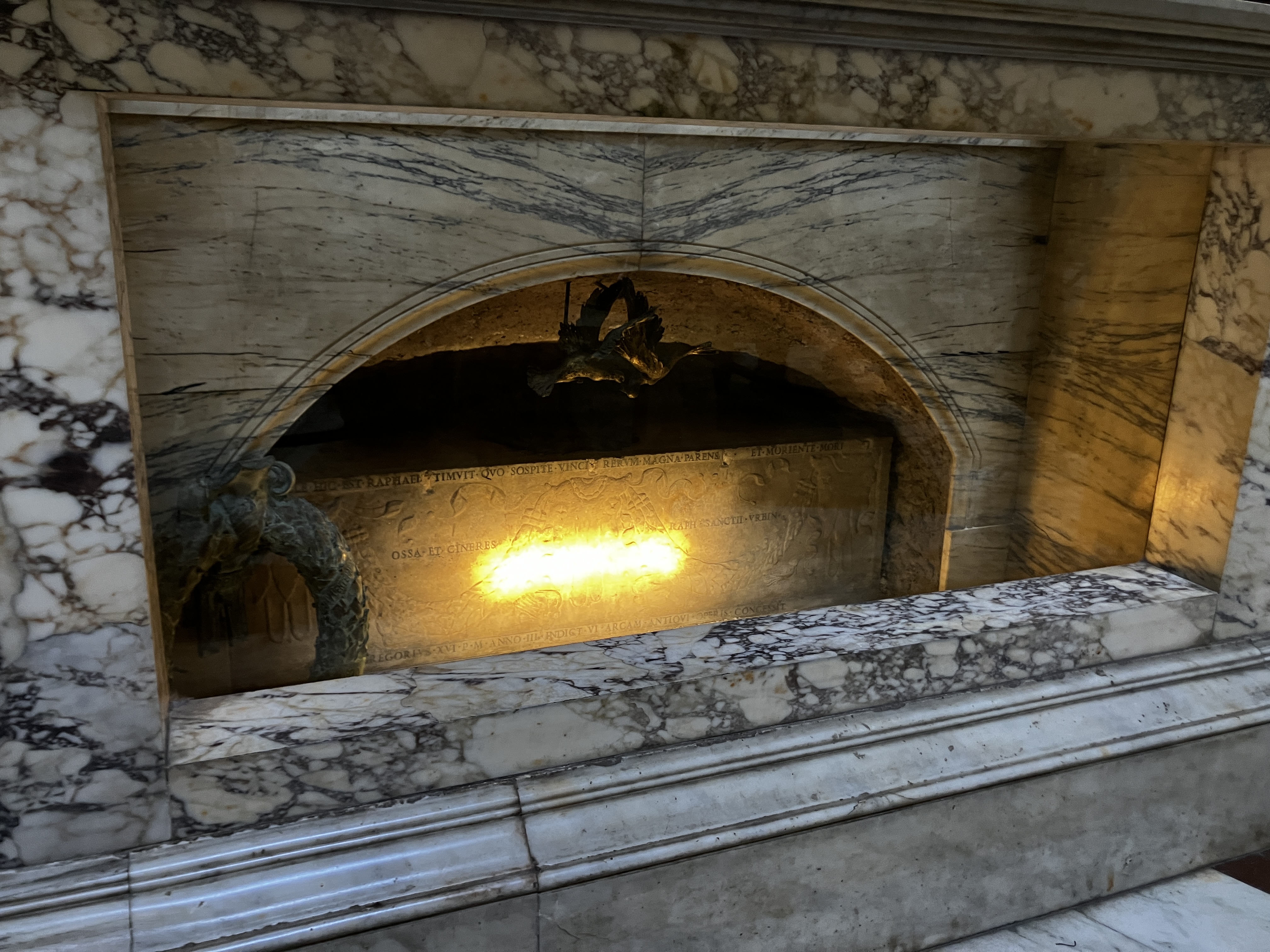 A busy day, we got an early start and headed to the Pantheon for a self-guided tour. This was a much more relaxed way to take in the sights. The building is immense and literal perfection – the width of the dome is 142 feet and the height at the top of the dome is also 142 feet from the ground, meaning that a massive perfect sphere could fit inside it. To give you an idea of the scale, the open oculus at the top is 30 feet across! While created to house statues of all the Roman gods and goddesses, it has been a church for the last 1,600 years (in addition to housing honorific tombs like Raphael (above) and the first king of united modern Italy). Next to the Pantheon was a stunning gothic church built over a former temple of Minerva. Highlights were the painted/gilded ceiling, the sculpture of Christ the Redeemer by Michelangelo, and a marble sculpture in honor of Mary made to look like billowing fabric.