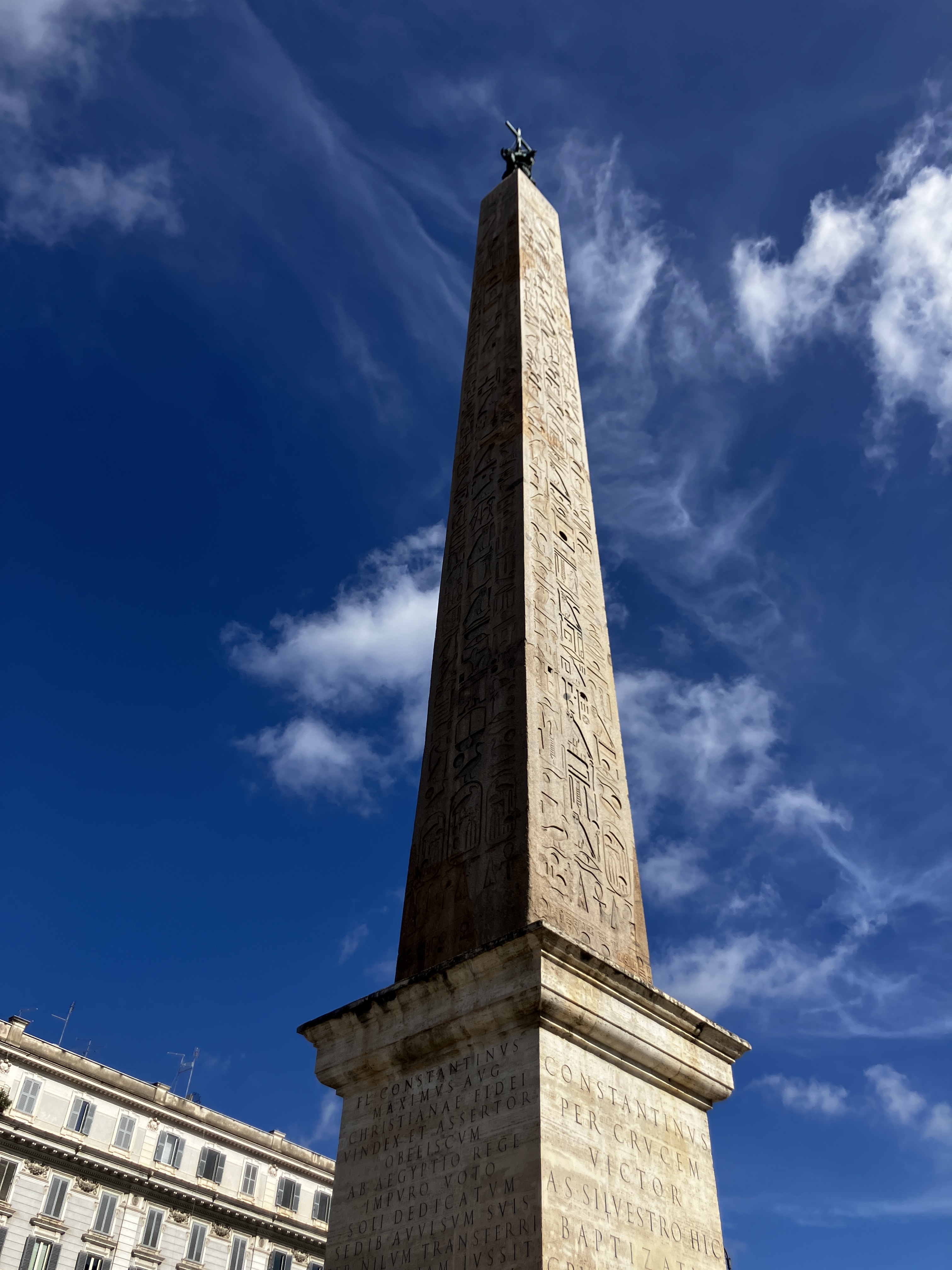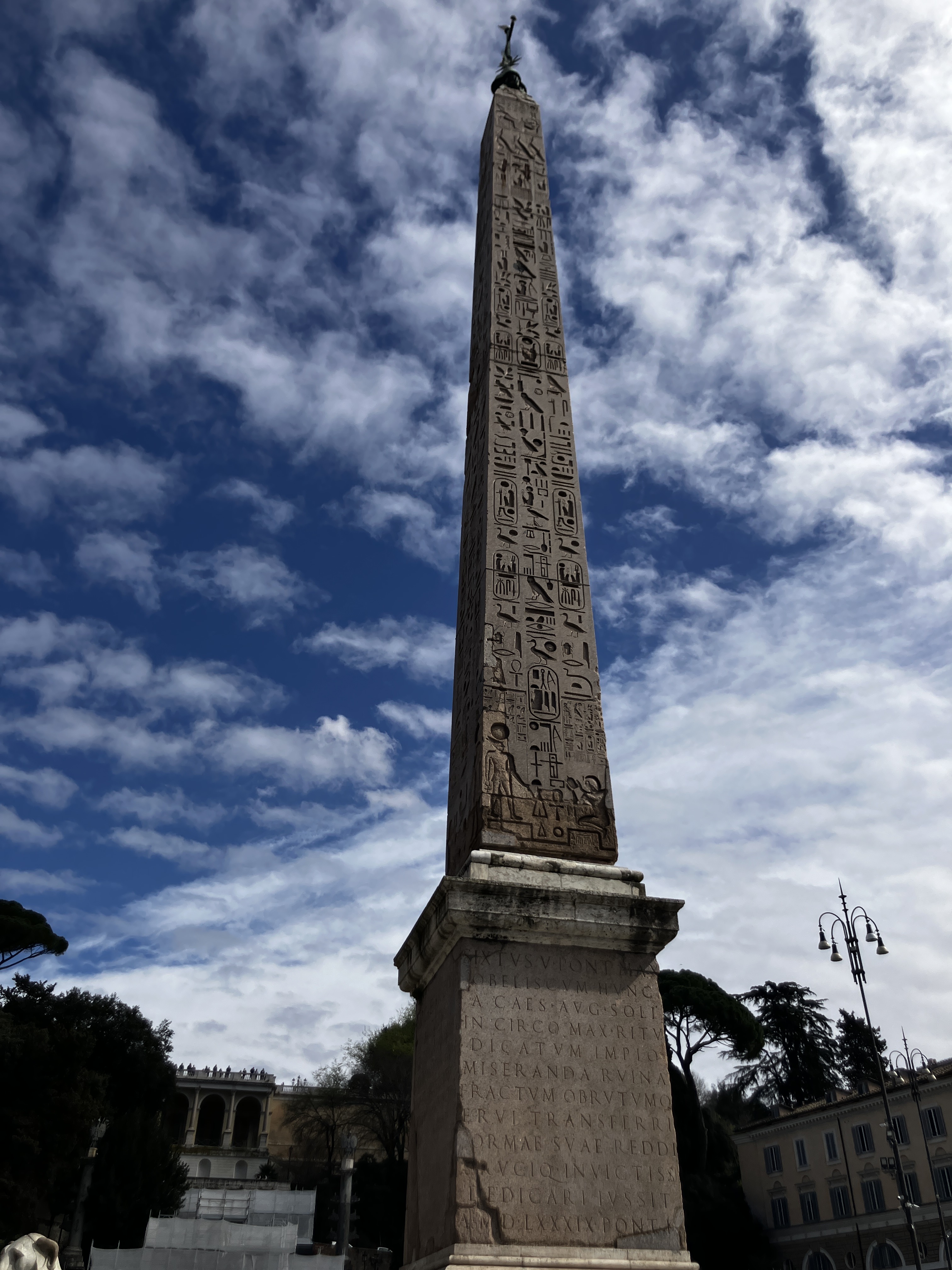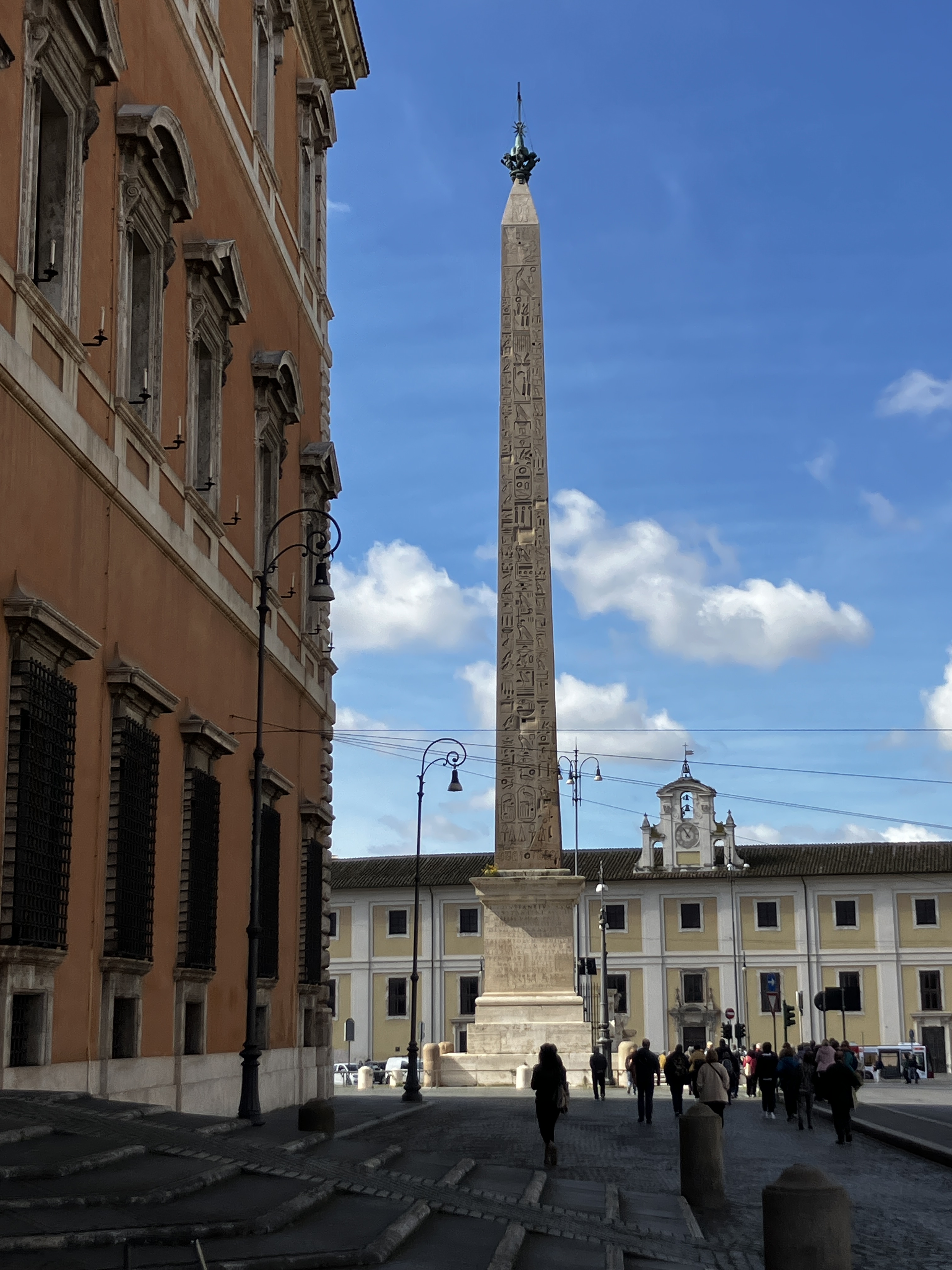 Our last day in Rome, we split up – Raymond and Michelle went to St. Peter’s Square for some last minute souvenirs and I went on an epic walk: St. Peter’s Square to Castel Sant’Angelo, across the bridge over the Tiber river and onward through a very ritzy part of the city to the Spanish Steps. As you can probably tell, I was fascinated by the many obelisks in Rome (a total of 12 as listed on this 19th century post card) and decided to visit as many of them as I could (marked in yellow). When I read that the Lateran Obelisk is the largest Egyptian obelisk in the world I became determined to see it. So I hopped on the subway and traveled to the southeast part of Rome. It was very impressive – 105 ft of red granite with deep, clearly cut hieroglyphs commissioned by pharaoh Thutmose III in 1400 b.c.