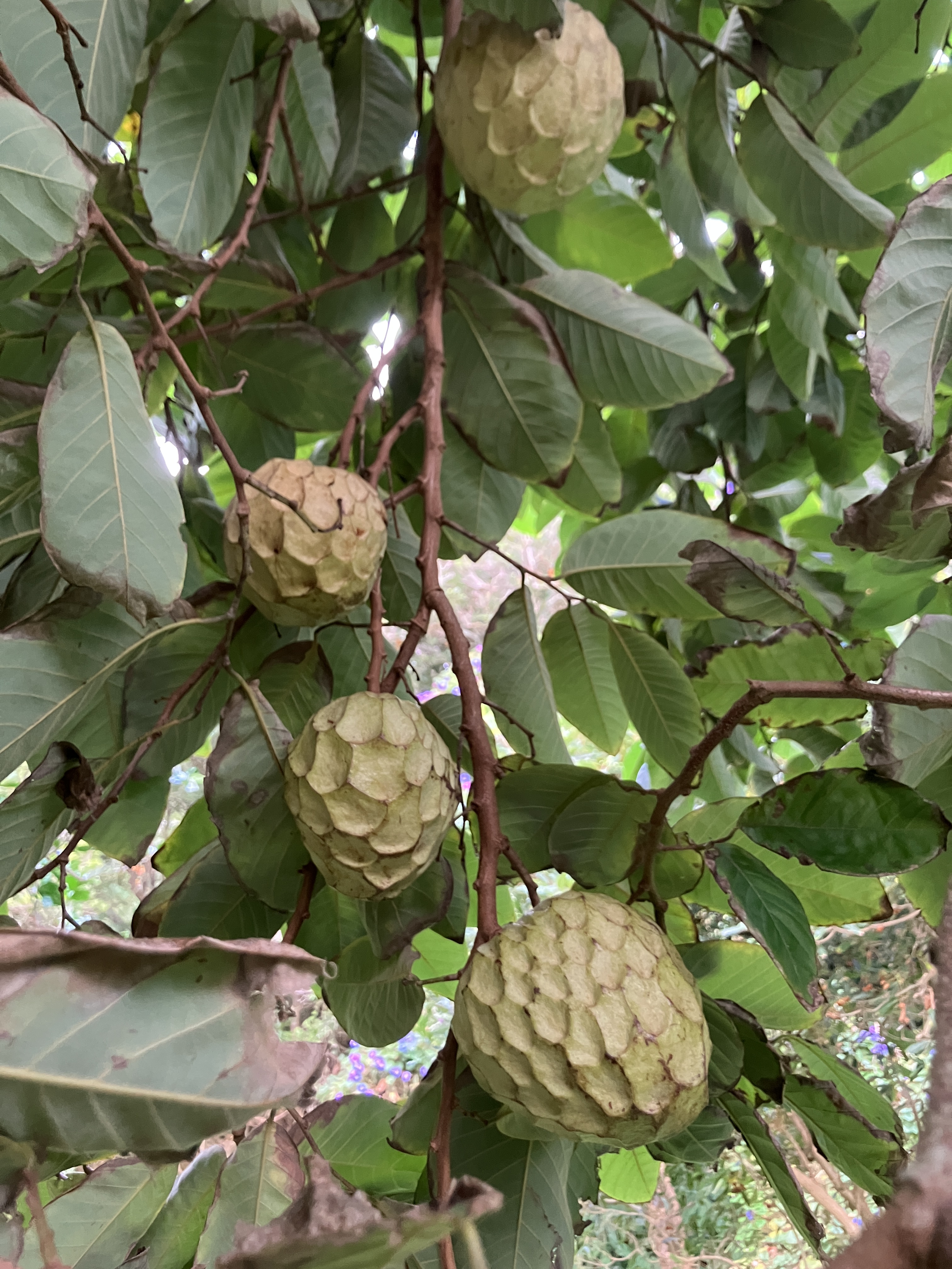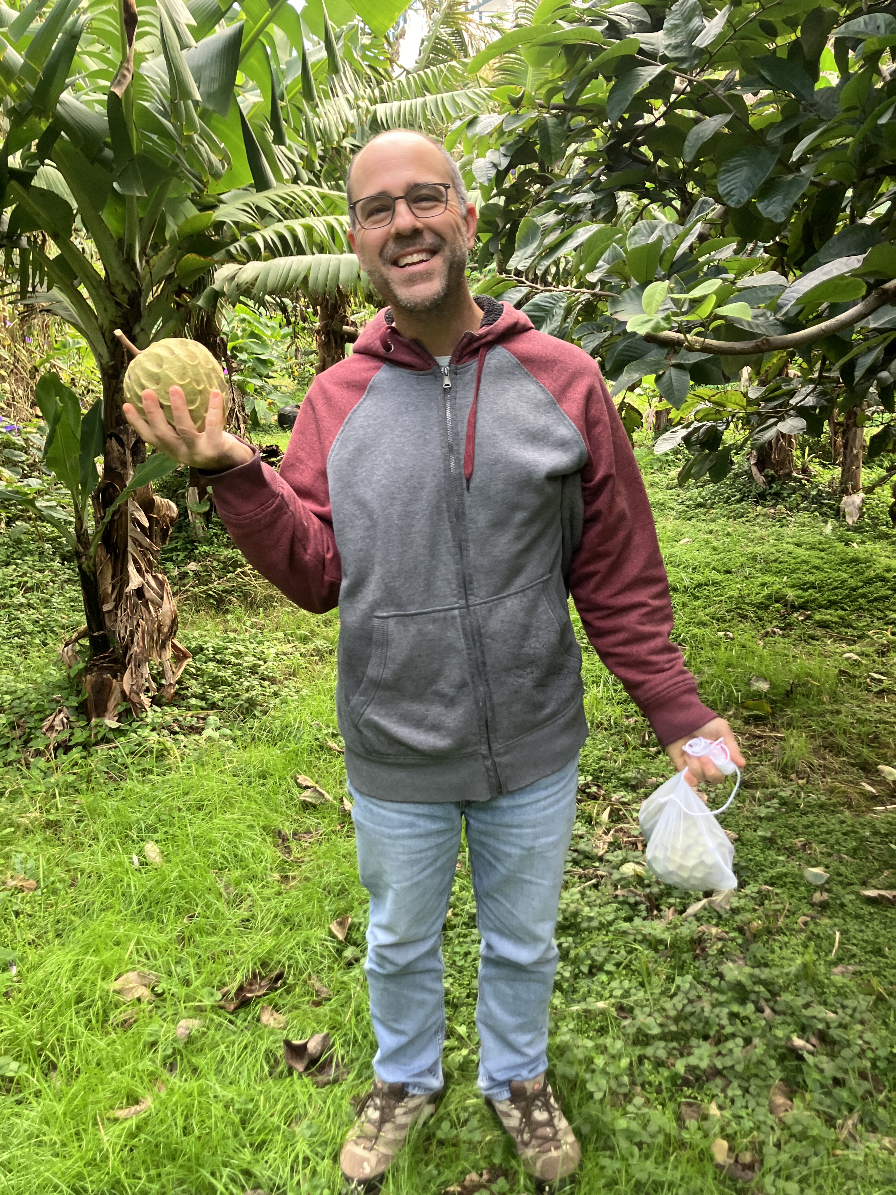 We have been harvesting some beautiful purple-skinned, white-fleshed sweet potatoes from our garden and cooking them in soups as well as a Thanksgiving pie. The anonna fruits seem to be a bit delayed this year, but we have already eaten four that we ripened in the basement and they were delicious as always. Lastly, a big bunch of bananas reached maturity and were similarly ripened in the basement – something like 20 lbs of bananas… We gave some away to colleagues at work, some to our neighbor, and made a total of three batches of banana bread. Even after that, there are still about two pounds hanging up downstairs.