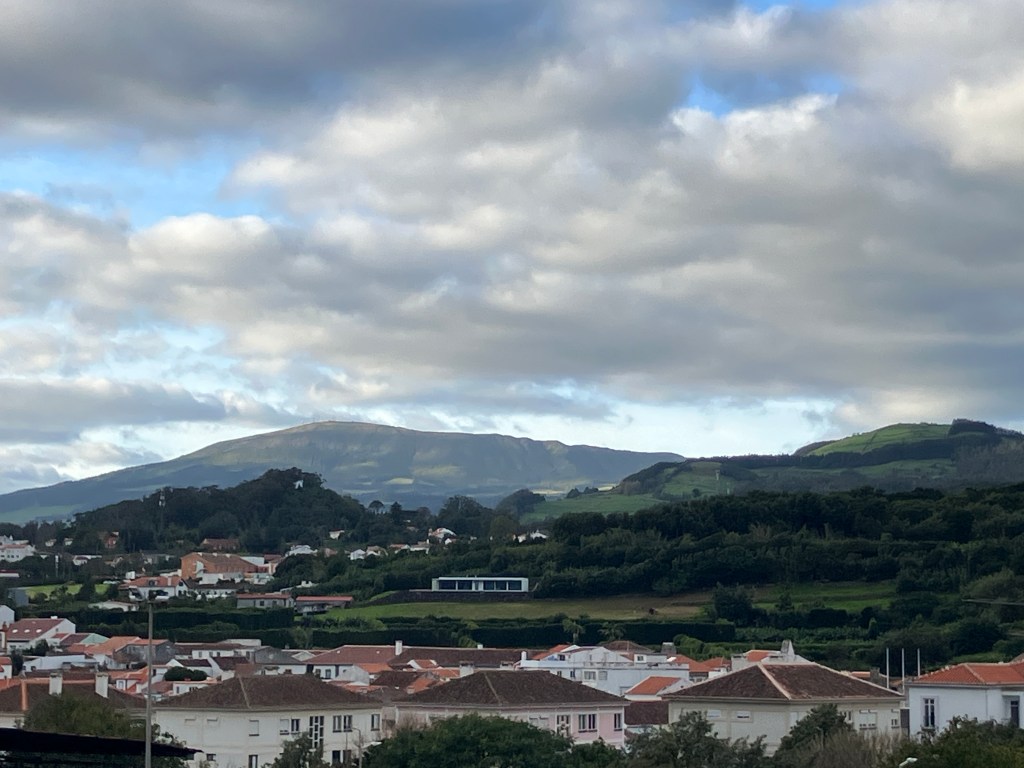 This is a view from Angra of the Santa Bárbara mountain/volcano, the high point of Terceira at 3,300 feet above sea level. The youngest of the volcanoes that formed the island, it is also the one from which nearly all seismic activity originates. After a lull during the summer, the number of earthquakes has increased dramatically in the past month.
