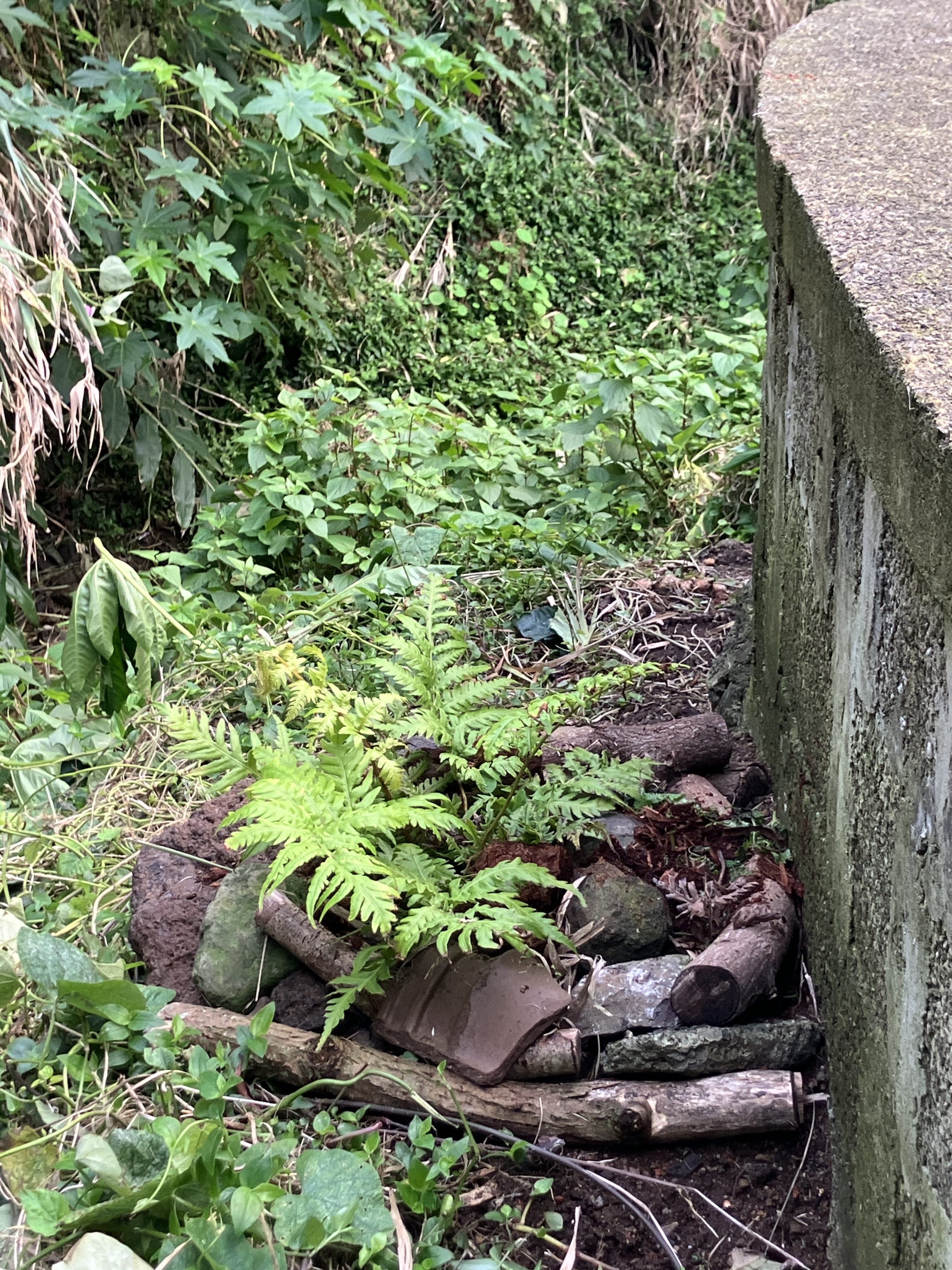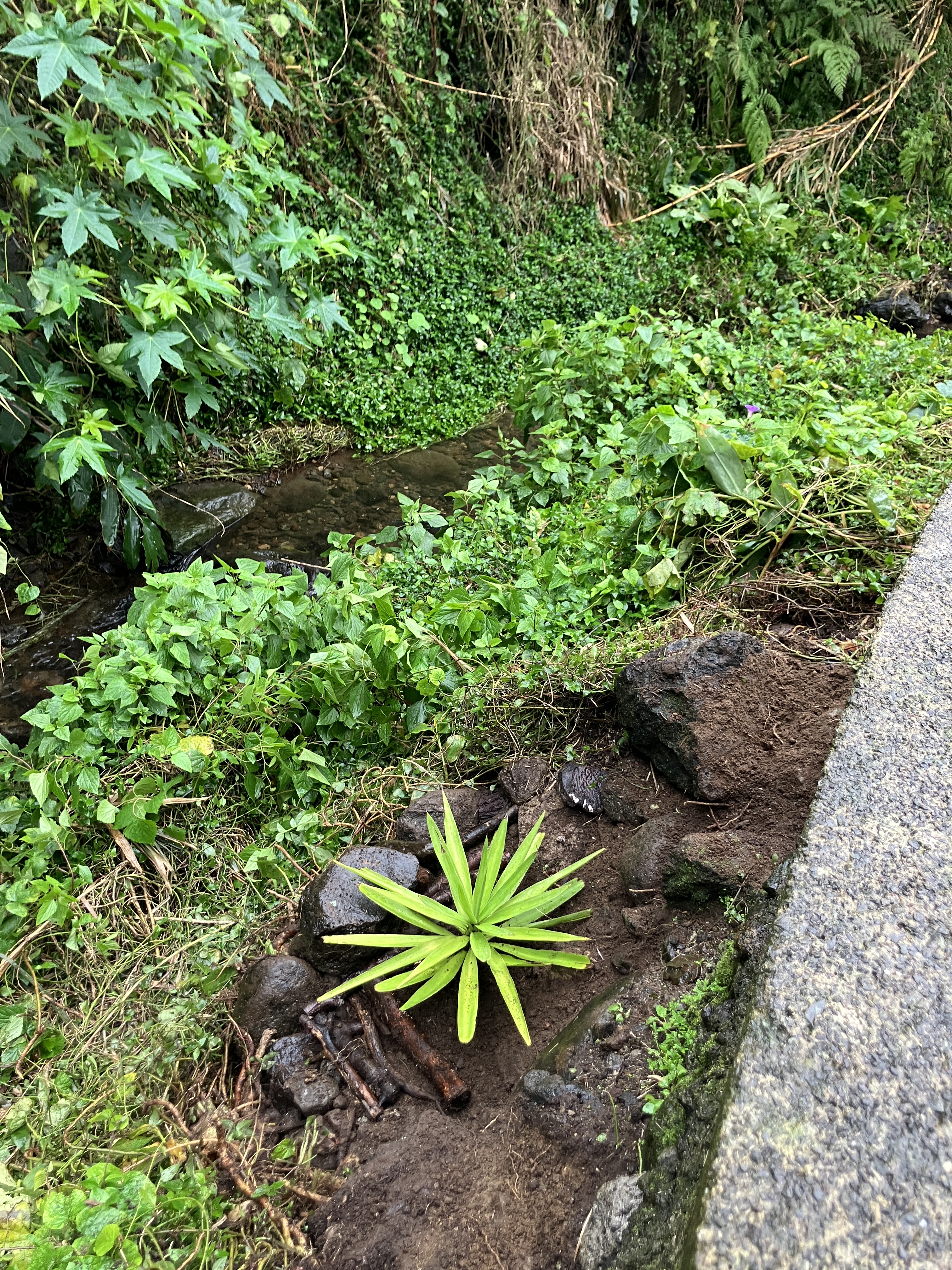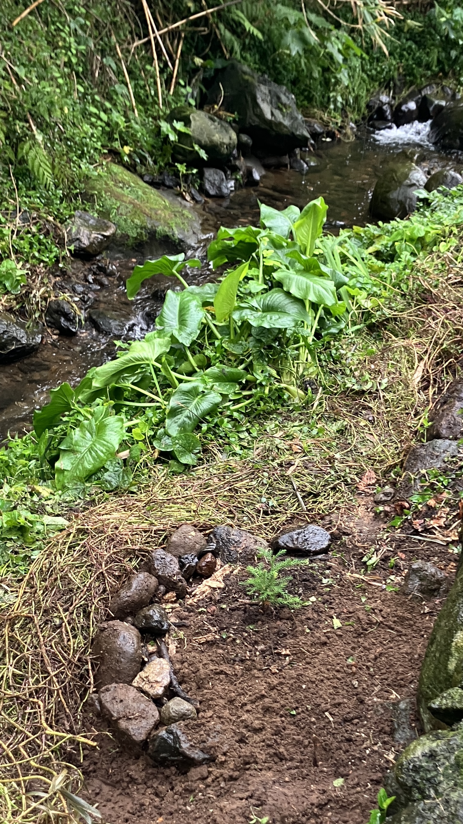 After many months of enjoying various potted plants that were found on or near our property, I finally started finding places to plant them. The tree fern, Japanese cedar, and dracaena all found homes along our patio wall. Aside from looking beautiful, they should help secure the stream side from future floods (we have plans for additional Japanese cedars to be planted as well).