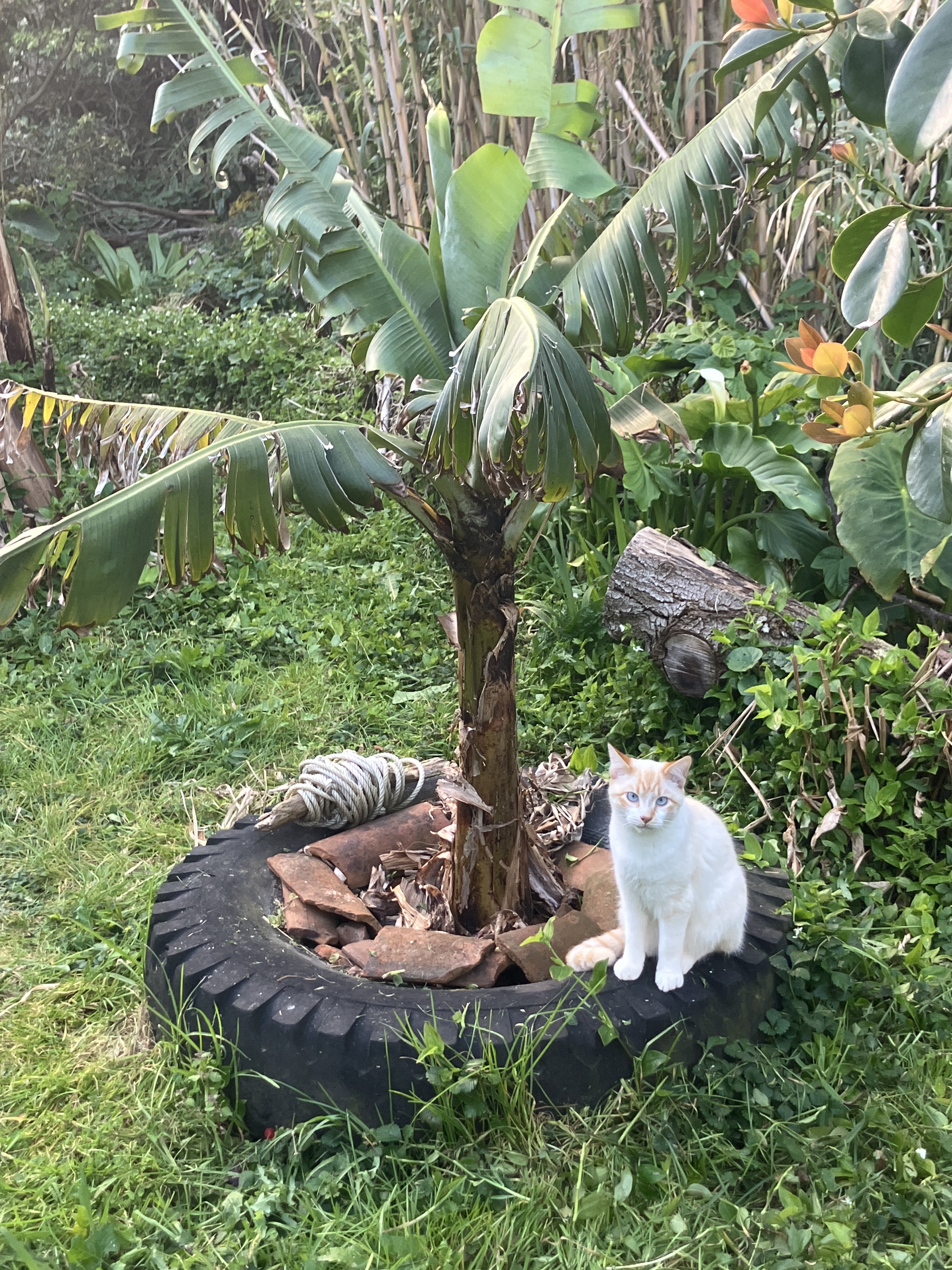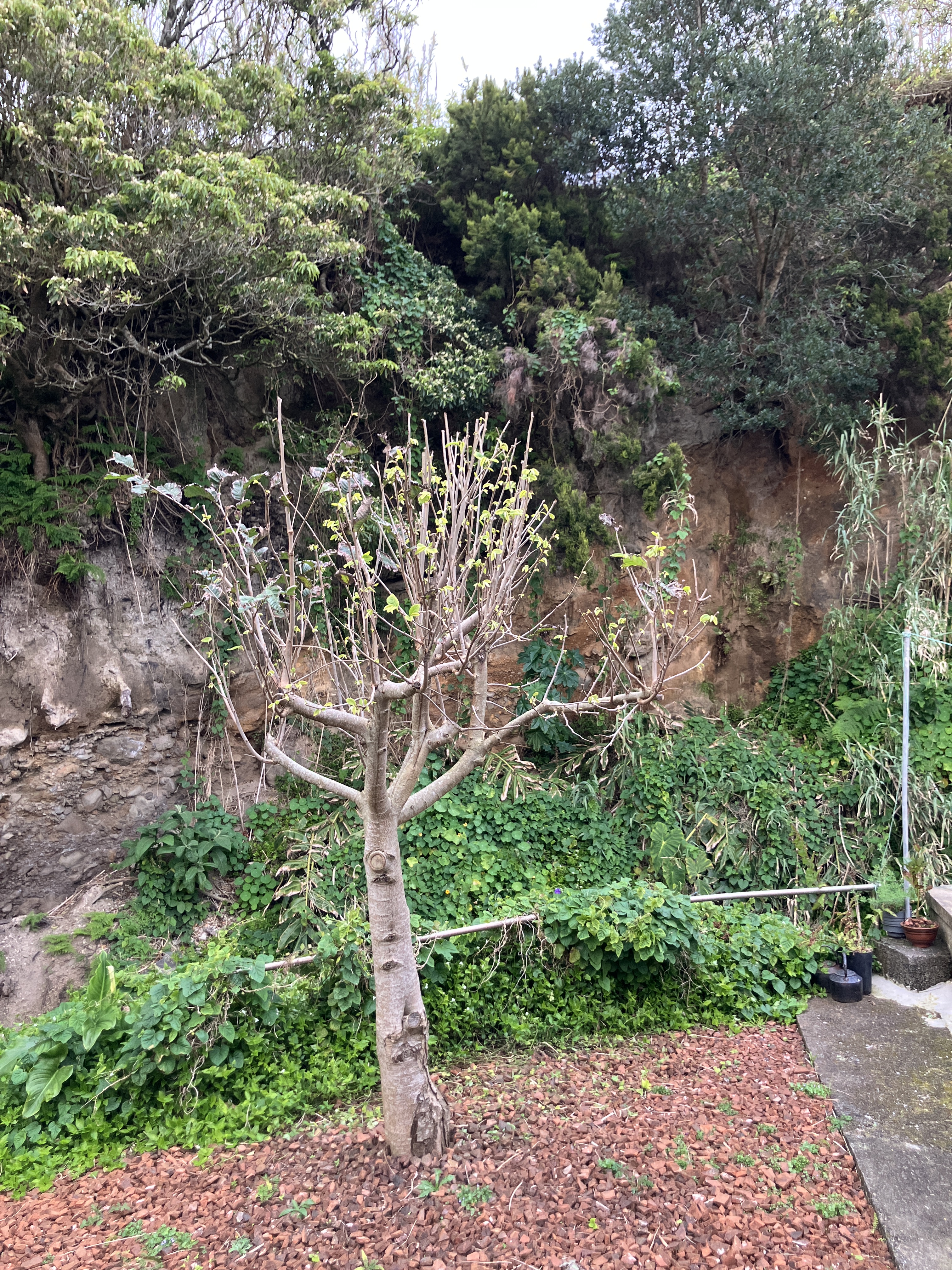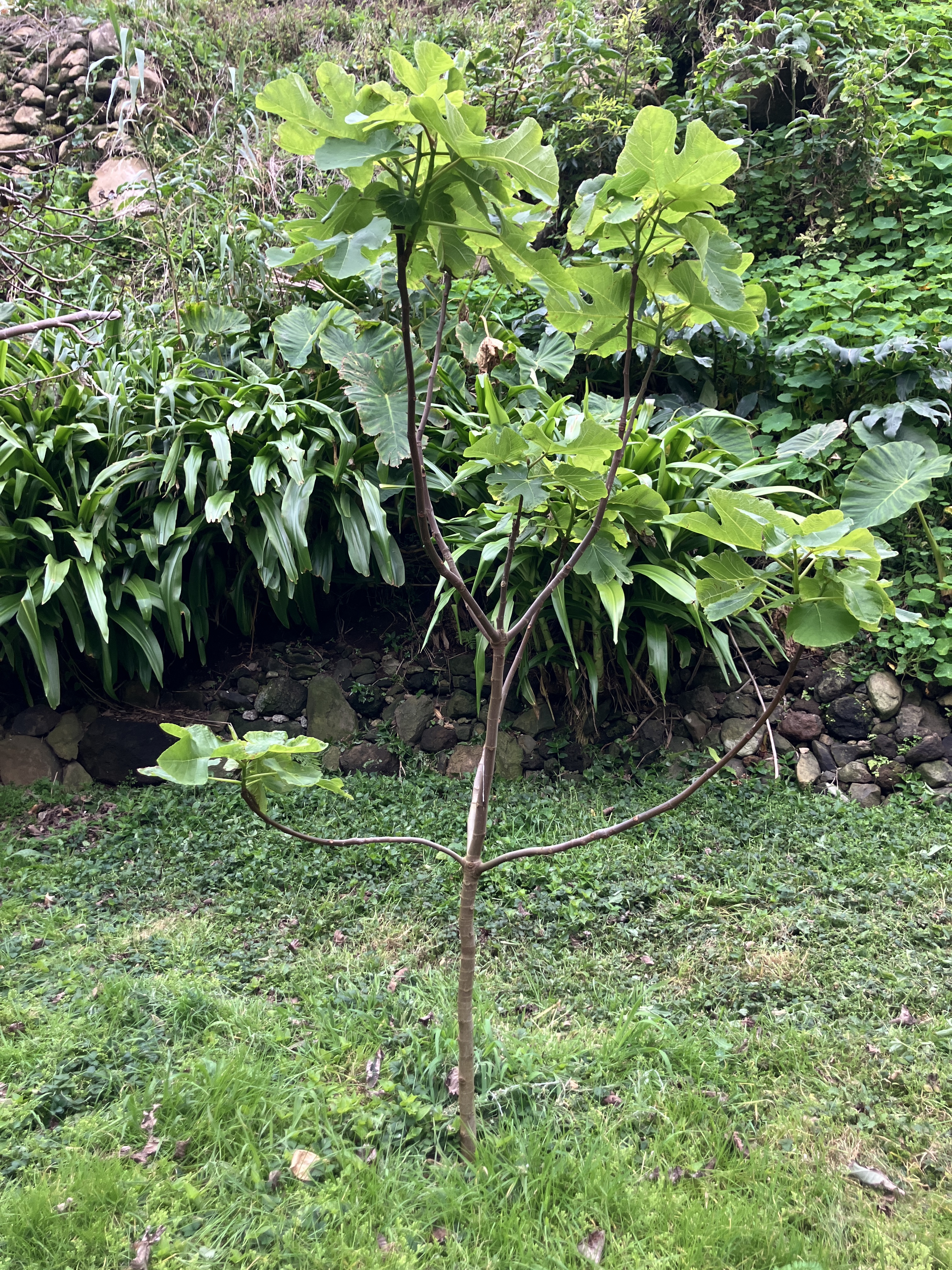 Middle row: the black fig leafing out and the smaller annona newly trimmed