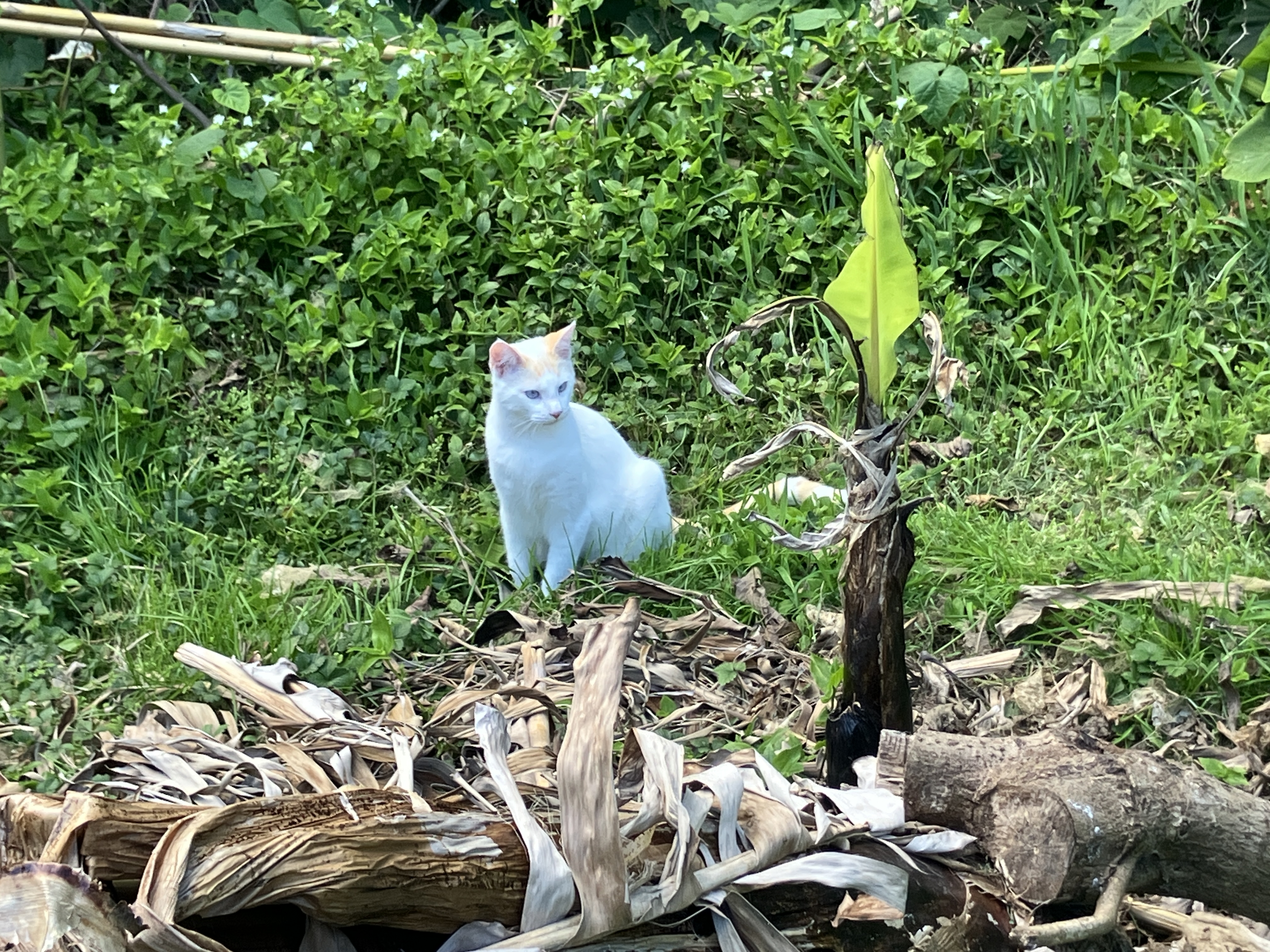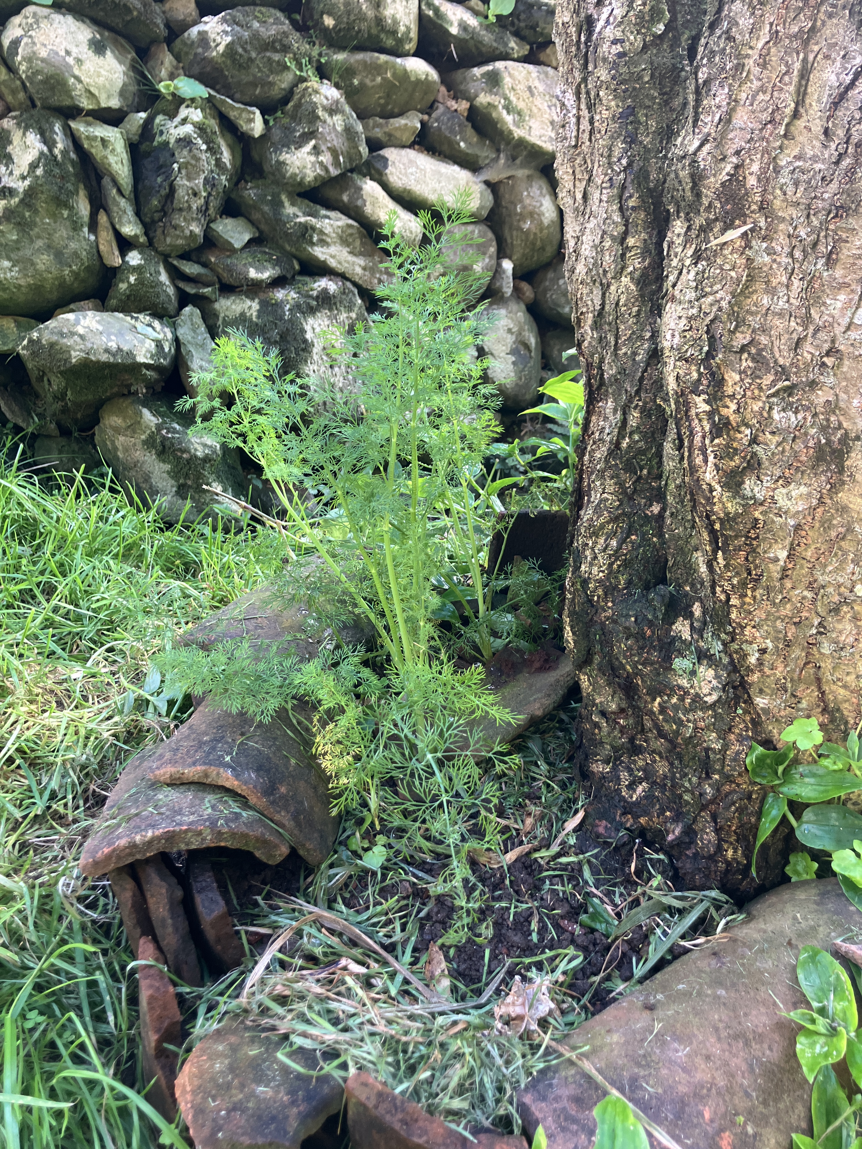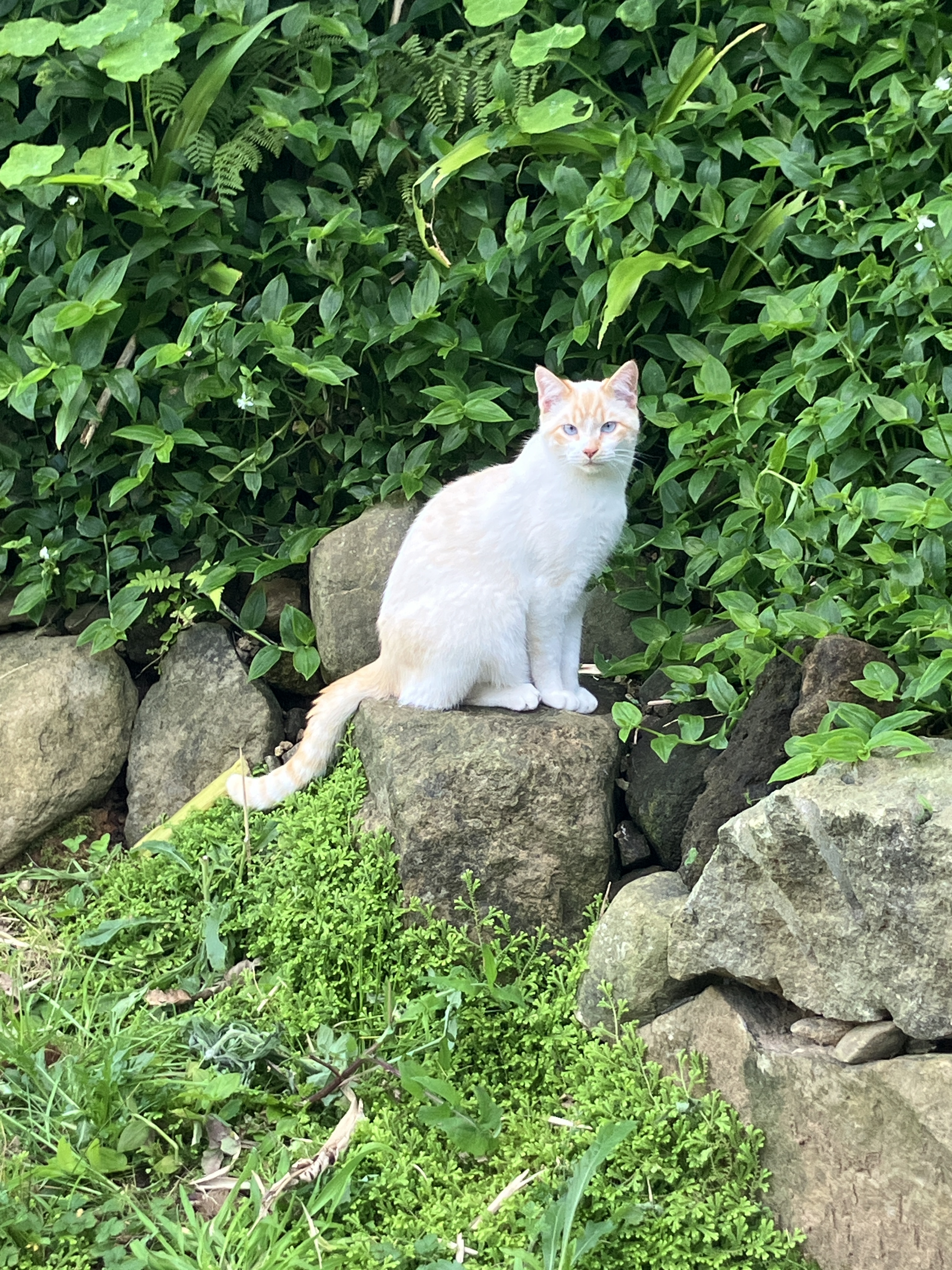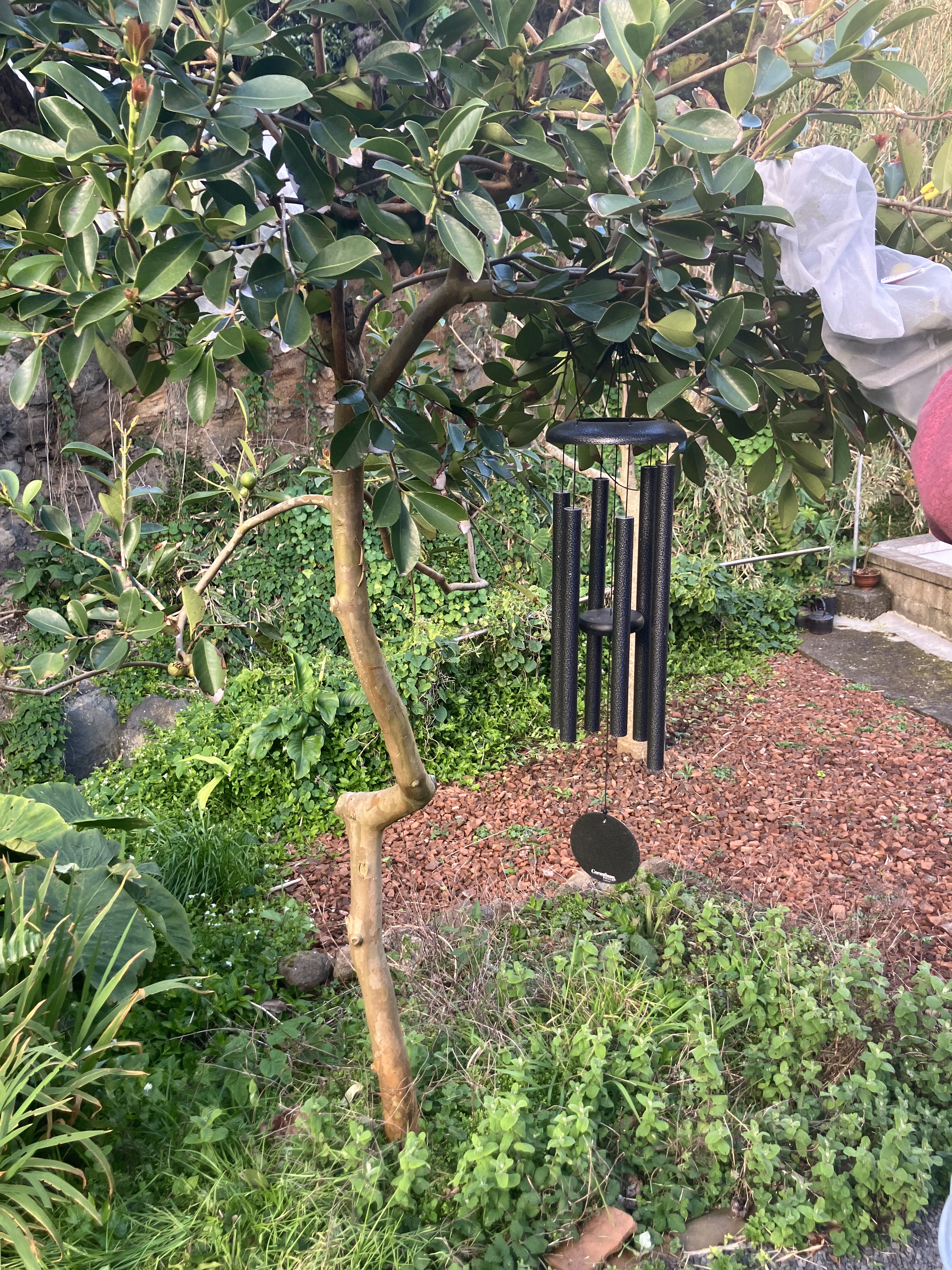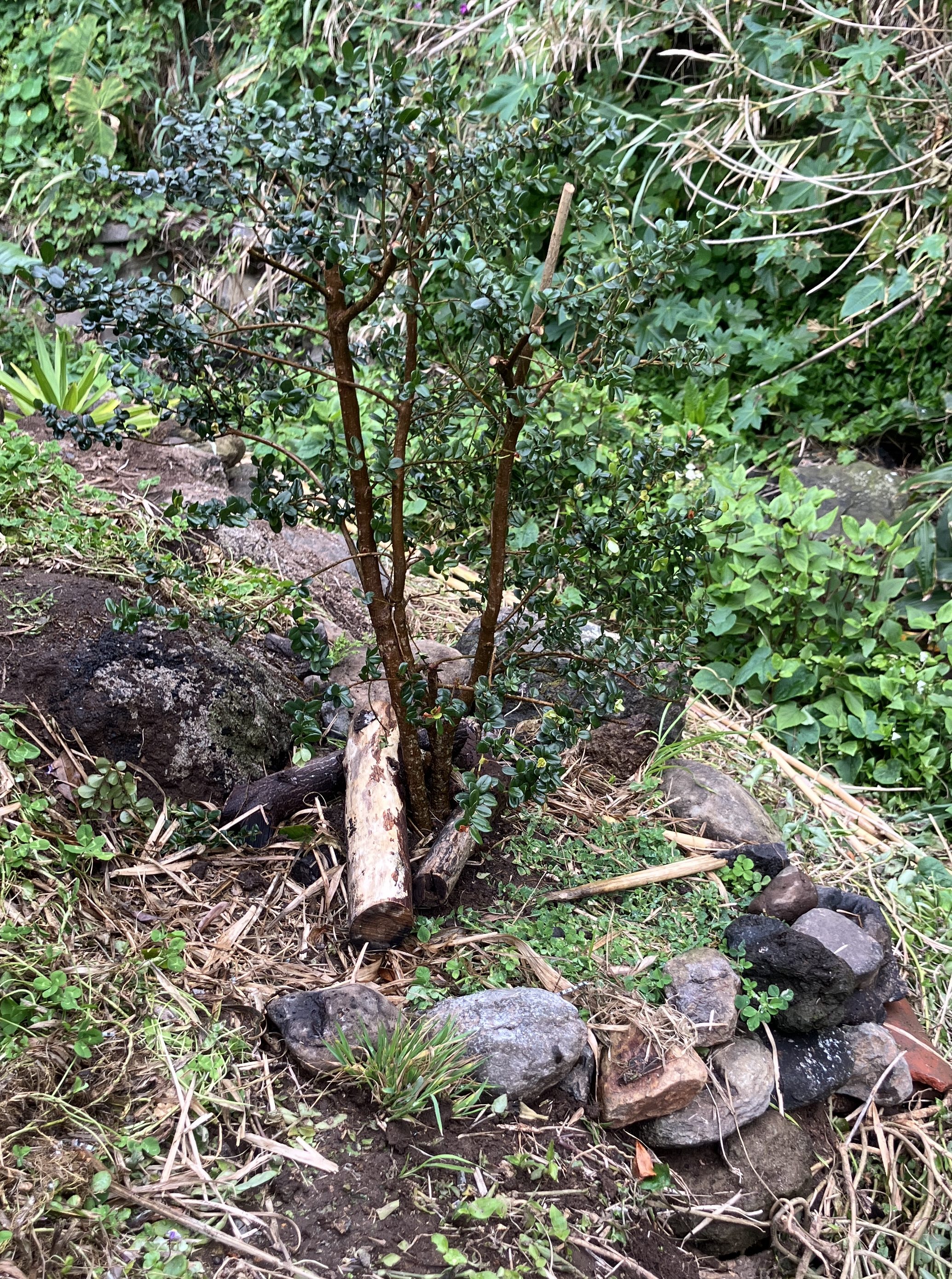 On my most recent day off I felt motivated to clean up some more of the stream-facing side of our patio wall. It provided another great place to plant something, this time a transplanted African Boxwood that had blown over in the back yard. A waxy-leafed evergreen, Myrsine africana is native to southern and eastern Africa as well as the Azores. It fits right in between the Japanese Cedar (foreground) and the dracaena (background).