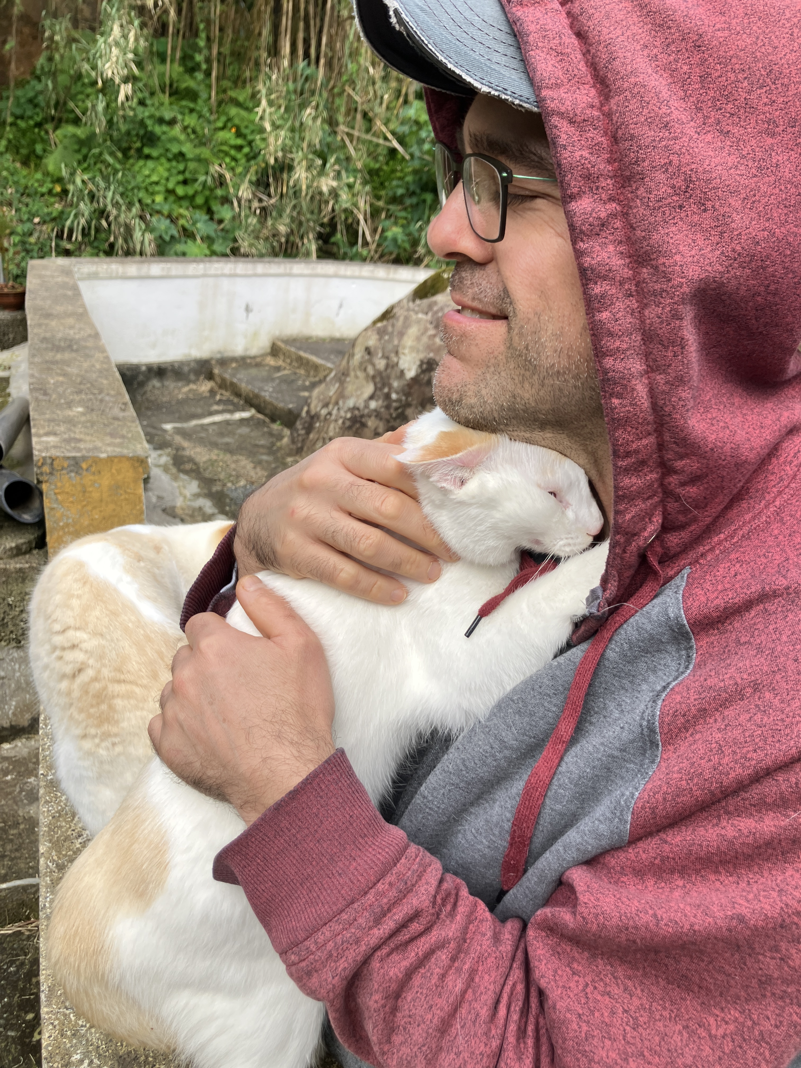 Nicodemus and Archimedes are doing well and as sweet as ever! Archie likes to greet Raymond and I at the door when we arrive home, running up from the lower patio while Nicky joins a few moments later with a stretch and a yawn. Our routine is to then have some cuddle time in the basement ‘cat lounge’ – Archie on Raymond’s lap, hugging his neck and Nicky on my lap, nuzzling into my elbow. Afterward, they love our daily walks through the back yard, chasing each other up trees or wrestling in the grass.