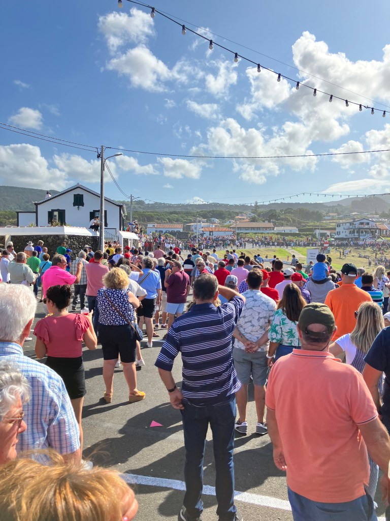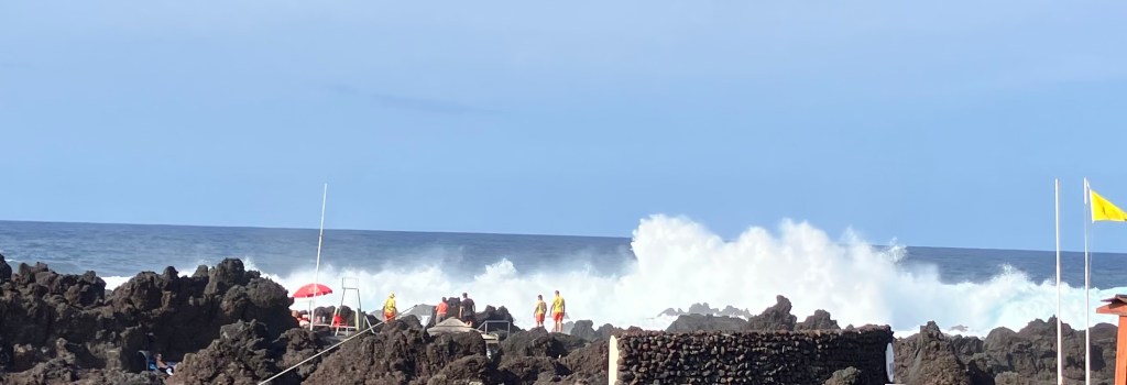 One of the simple pleasures of life here on Terceira is just driving around and seeing the sights. From a random horse-drawn cart, to countless fields of grazing cows, to otherworldly scenes of volcanic hills (cinder cones) and Japanese cedar forests, there is never a dull moment . Returning home one particular afternoon we even drove through a rainbow! Look closely at the lower-right photo – on a clear day from the southeast coast one can see the island of São Jorge (and sometimes Mount Pico on the island of Pico behind it, towering above).