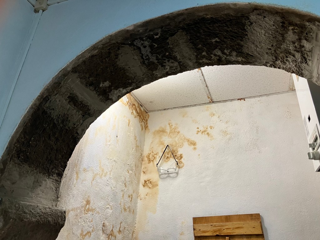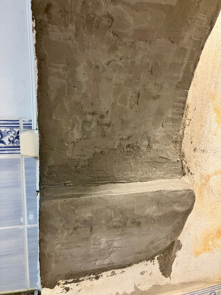 Continuing with our project to deconstruct the millstone, we needed to cut the rusted steel rod that once turned the (now removed) upper millstone. We were not able to pull it out as it was affixed to some apparatus below the floor. After considerable effort and sparks, we succeeded in cutting through the nearly 2-inch thick rod and dropped the mechanism to the chamber below. It would seem that at some point water flowed under the mill room and turned a water wheel in this lower chamber. Free from the rusted rod, we applied a layer of cement to seal up the center hole. No more musty drafts nor bugs in the laundry room!